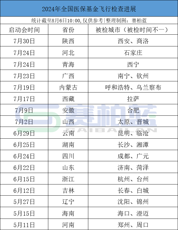 截至目前,全国17省已经开展医院现场检查。 九月底前完成 大批医院将被现场检查 8月4日,国家医保局发布消息,国家赴青海医保基金飞行检查正式启动。 截至目前,国家医保基金飞行检查已经在17省开展,分别是陕西、河北、青海、广西、内蒙古、西藏、安徽、山西、云南、湖南、四川、山东、浙江、吉林、辽宁、海南、河南。 全国31个省、直辖市、自治区(不含港澳台),目前还有14省暂未启动国家医保基金飞行检查。按照国家医保局对医保基金飞行检查的安排,接下来不到两个月的时间里,其余省份也将陆续开展现场检查(9月底前完成)。 7月,国家医保局曝光医院违规使用医保基金典型问题,主要涉及七类问题,包括串换项目、分解收费、超标准收费、重复收费、过度检查、虚构医药服务项目、将不属于医保支付范围的纳入医保基金结算。 与此同时,各省纷纷公布2024年医保基金飞行检查名单。从大三甲至基层医疗机构,全国大批医院被列入待检名单。 一些省份在召开国家医保基金飞行检查启动会现场就直接采取抽签的方式确定了被检机构及零售药店。例如,西安市第三医院、西安唐城医院为被检医疗机构,西安怡康医药连锁有限责任公司为被检零售药店。 今年来,国家医保局多次强调,强化大数据筛查手段在医保基金监管中的应用,筛查分析苗头性、倾向性、趋势性问题,实现精准打击。此前,国家医保局陆续通报河南、辽宁两家医院涉嫌欺诈骗保问题,都是通过大数据模型筛查发现可疑问题线索。 国家医保基金飞行检查结果跟进迅速,不少在飞检中发现存在欺诈骗保问题的医院已经被点名,“边检查边通报”,医保基金飞行检查震慑作用更加明显。 7月24日-26日,国家医保局党组成员、副局长颜清辉带队赴安徽省调研医保基金监管法治建设、智能监管等工作。