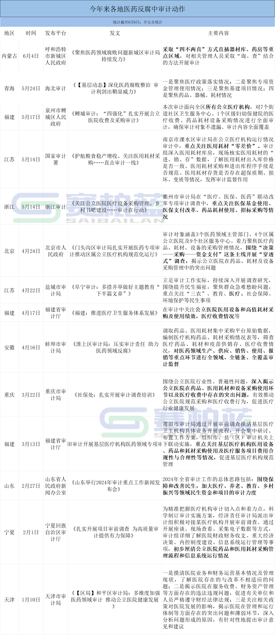 今年来,除了国家医保基金飞行检查,审计、卫健委等多部门也正在对医院进行强监管。 据赛柏蓝不完全统计,截至目前,广西、山东、安徽、重庆、宁夏、福建、江苏、浙江、北京、内蒙古等多个省份审计部门均在医疗反腐领域开展相关工作,重点关注公立医院在药品、医用耗材和设备采购使用环节及医疗收费等方面存在的突出问题。同时,不少地方将医疗收费、医用设施购置、药品采购及验收环节的审计纳入重点监督范围。 例如,7月,广西市场监管局召开全区市场监管系统药品和高值医用耗材生产经销使用情况专项审计查出问题攻坚整改工作推进会; 安徽蚌埠审计局从三个方面关注公立医院药品管理,分别是审查药品采购情况、HIS系统的使用情况、药品进出库的程序和手续管理情况; 天津市审计局从本级预算执行审计、直达资金专项审计、专项审计调查等多维度加强医药领域审计。 此外,还有地方审计局设置线索举报方式,收集地方医药领域腐败问题相关信息。 国家卫健委等十四部委发布《关于印发2024年纠正医药购销领域和医疗服务中不正之风工作要点的通知》指出,开展公立医院和药品医疗器械生产经销使用情况专项审计调查,重点关注推高药品价格等。 《中央巡视工作规划(2023-2027年)》也提出,深化巡视监督与纪律监督、监察监督、派驻监督统筹衔接,加强巡视监督与组织监督协作配合,充分运用审计、财政、统计等部门的专业力量和监督成果,增强监督合力。 目前来看,审计、卫健、医保、市场监管等部门正联合对医药领域腐败问题集中整治发挥作用。