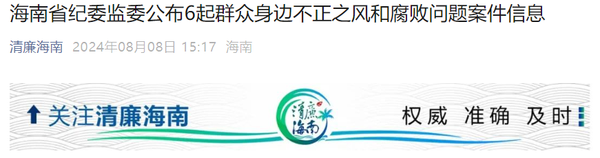 8月8日,据“清廉海南”发布消息:《海南省纪委监委公布6起群众身边不正之风和腐败问题案件信息》,文中提到: