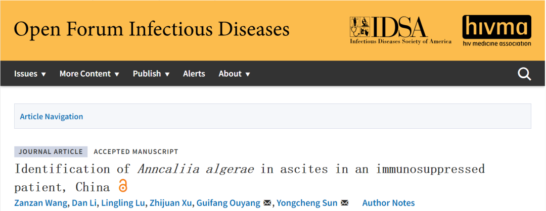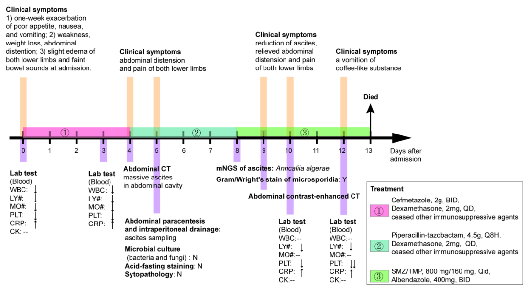 近日,迪安诊断与宁波市第一医院血液科团队合作,在Oxford旗下期刊《Open Forum Infectious Diseases》(IF=3.8),报道了一例非既往报道临床表现的Anncaliia algerae感染病例。 该案例通过利用宏基因二代测序技术(mNGS)辅助临床鉴定与识别不明原因累积腹水中Anncaliia algerae病原,为临床诊疗提供依据,强力揭示了mNGS在疑难或不明原因感染病例的早期诊断和个体化治疗中,具有潜在的应用价值。 论文发布截图,点击文末“阅读原文”查阅全文 研究背景 Anncaliia algerae (A. algerae)是专性细胞内寄生的微孢子虫。作为一种机会性病原体,它可以感染多种宿主,尤其困扰着患有类风湿性关节炎、器官移植和血液系统恶性肿瘤等免疫功能低下人群。 肌炎是A. algeare感染最常见的疾病表现。此外,人类微孢子虫可以侵染包括肠道、肝、肺、脑等器官,皮肤、眼睛、声带等部位也曾发生A. algerae感染。A. algerae感染具有较高死亡风险,因此,精确诊断和及时治疗十分关键。 研究内容 63岁患者的罕见不明原因感染 患者临床病程及治疗方案 一名63岁患者入院前由于疾病史长期服用免疫抑制剂。入院时,患者主诉食欲不振、恶心、呕吐、腹胀等症状已持续近一周。 经体格检查显示:双下肢水肿、肠鸣微弱、腹部压胀。检查过程中,患者四肢未见肌肉压痛,肌酸激酶水平未有明显异常,排除肌炎可能;双肺呼吸音清晰且无干湿杂音;肝肾功能指标正常,B超也显示肝脏大小形态正常,密度均匀;超声心动图无异常,心脏收缩和舒张功能正常,均与既往报道A. algeare感染的临床表型不符。 患者接受“肠梗阻”的治疗方案,在治疗阶段中腹胀加重,病情进一步恶化。 腹部计算机断层扫描的代表性图像。黄色箭头显示肠壁增厚和粘膜水肿;红色箭头显示黏膜充血;肠壁周围模糊的脂肪间隙表明腹腔积液。 腹部计算机断层扫描(CT)显示肝脏、胆囊、肾脏、胰腺、子宫和膀胱未见异样,但肠壁增厚,肠壁周围脂肪空间模糊,粘膜水肿,腹腔中存有大量腹水。于是,在超声引导下对患者行腹腔穿刺和腹水引流。腹水样本的抗酸染色、微生物培养(细菌和真菌)及细胞病理学结果均为阴性。 mNGS检测辅助诊疗终见结果 mNGS鉴定腹水中A.algeare病原体 随后,显微镜下观察到腹水中存在一簇2-3μm的卵球形孢子。mNGS方法进一步阐明腹水中A. algerae感染。同时,大便镜检的微孢子虫阴性结果表明,感染并非肠道来源。 于是,临床医生为患者确定了磺胺甲恶唑/甲氧苄啶(SMZ/TMP;800 mg /160 120 mg 4×/天)联合阿苯达唑(400 mg 2×/天)的治疗方案。 研究总结 本案例通过应用mNGS技术,首次在免疫功能受损患者腹水中成功鉴定了A. algeare这一罕见病原体。这一发现不仅丰富了临床对A. algeare感染相关表型的认识,更凸显了在面对免疫功能低下患者中出现的不明原因腹水累积时,考虑罕见生物体感染的必要性。 在应对临床疑难或病因不明的感染病例时,mNGS技术能够全面检测样本中的所有核酸序列,无论是病毒、细菌、真菌还是寄生虫,都能在复杂的微生物群落中精准定位病原体,为医生制定个性化治疗方案提供了有力的科学依据。 |