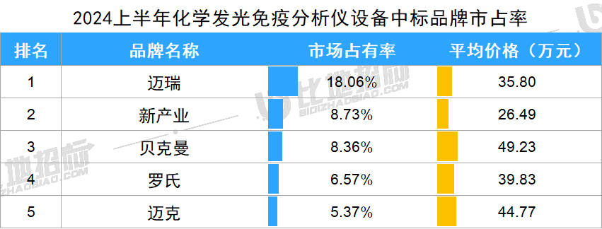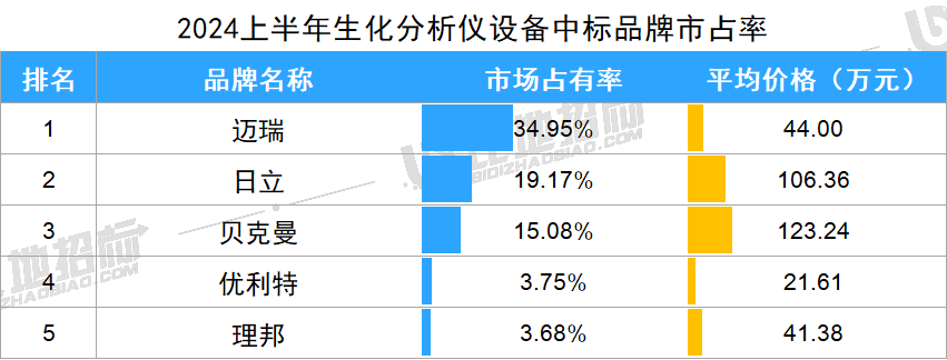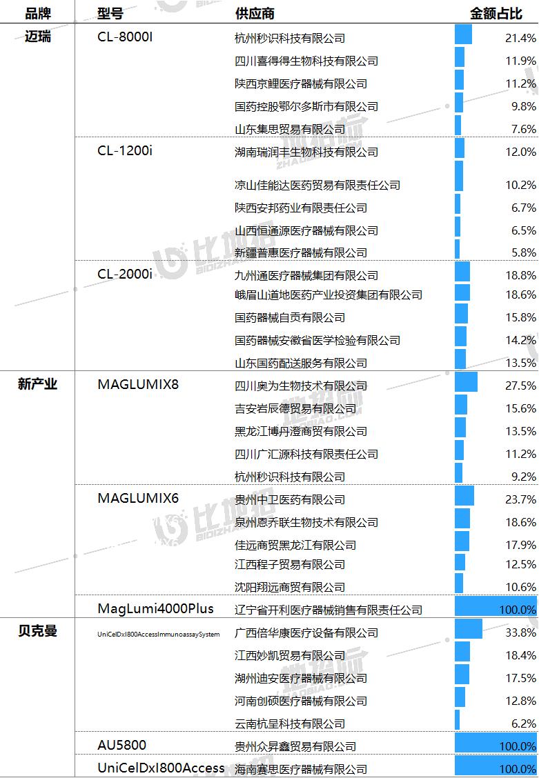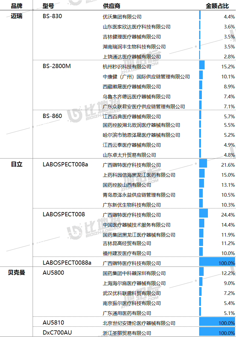 化学发光免疫分析仪 据比地招标网统计:2024年1-6月化学发光免疫分析仪设备招投标市场有888家采购单位,909家中标单位,中标设备数量达1244台,中标总金额约3.77亿元。 设备品牌方面,金额市占率较高的品牌有迈瑞、新产业、贝克曼、罗氏、迈克,市占分别为18.06%、8.73%、8.36%。前3品牌合计占比达35%,具有一定的品牌集中度。 数据来源:比地招标网 数据来源:比地招标网 数据来源:比地招标网 主要供应商及对应中标品牌包括:广西倍华康医疗设备有限公司(贝克曼),杭州秒识科技有限公司(迈瑞),四川奥为生物技术有限公司(新产业)等。 TOP3品牌型号供应商中标金额占比 数据来源:比地招标网 生化分析仪 2024年1-6月,生化分析仪设备招投标市场有1100家采购单位,1039家中标单位,中标设备数量达1470台,中标总金额约7.45亿元。 设备品牌方面,金额市占率较高的品牌有迈瑞、日立、贝克曼,市占分别为34.95%、19.17%、15.08%。前3品牌合计占比达69%,品牌集中度较高。 数据来源:比地招标网 数据来源:比地招标网 数据来源:比地招标网 主要供应商及对应中标品牌包括:广西锴特医疗科技有限公司(日立),国药集团中科器深圳有限公司(贝克曼),优沃集团有限公司(迈瑞)等。 TOP3品牌型号供应商中标金额占比 数据来源:比地招标网 来源:招采数据通(有删减)、体外诊断观察。 |