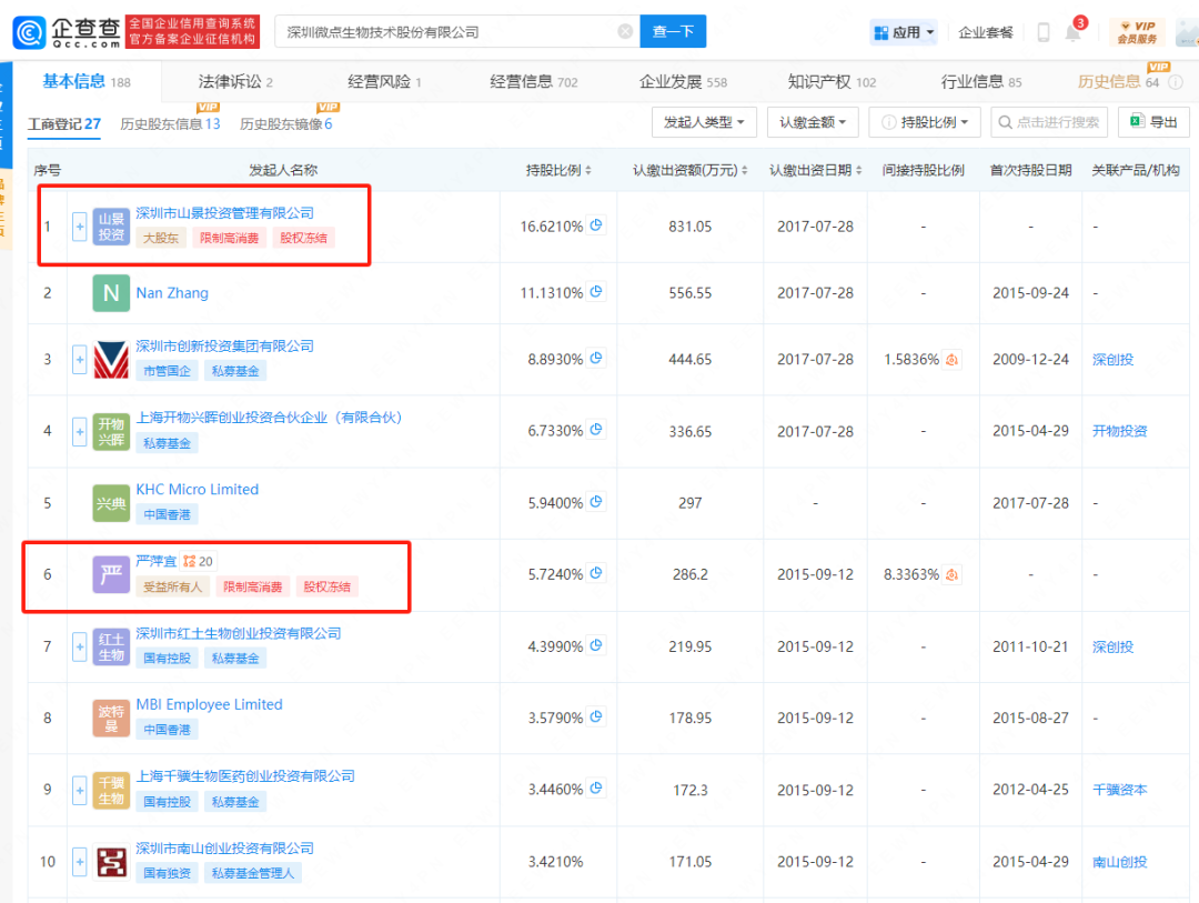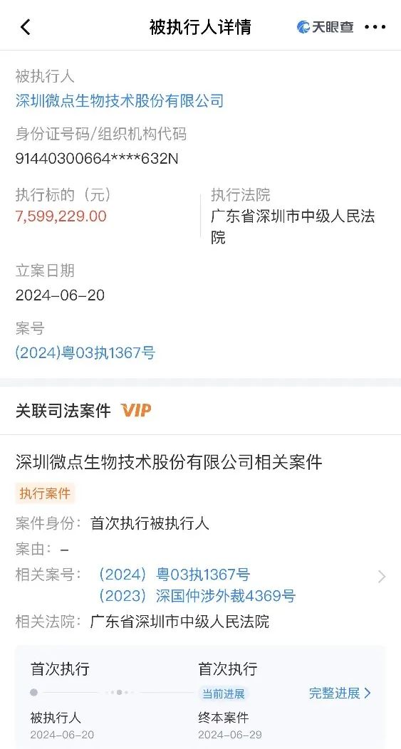 近日,据天眼查和企查查数据显示,深圳微点生物技术股份有限公司董事长严萍宜、大股东深圳市山景投资管理有限公司列入被执行人(案号:(2024)粤03执1367号),执行标的:7,599,229.00元。