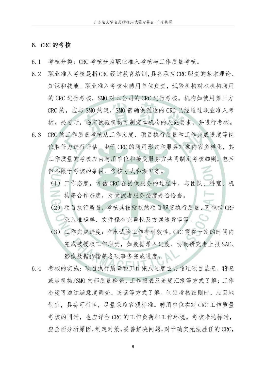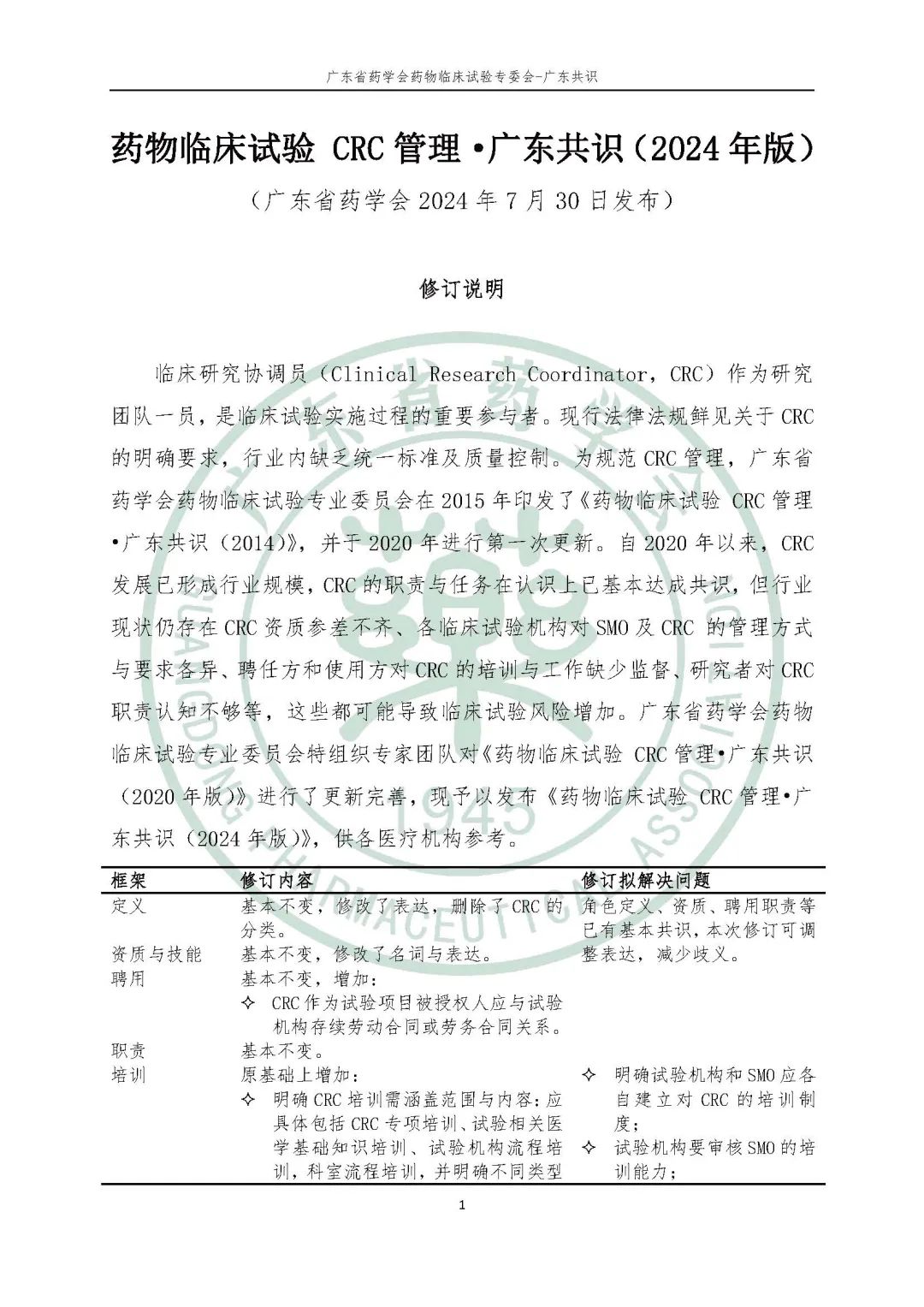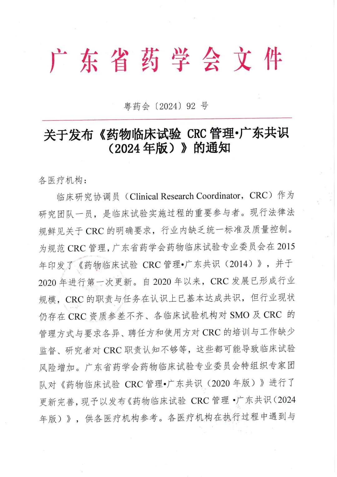 关于发布《药物临床试验 CRC管理广东共识 (2024年版)》的通知 粤药会〔2024〕92 号 发布时间:2024-07-30 各医疗机构: 临床研究协调员(Clinical Research Coordinator,CRC)作为研究团队一员,是临床试验实施过程的重要参与者。现行法律法规鲜见关于CRC的明确要求,行业内缺乏统一标准及质量控制。为规范CRC管理,广东省药学会药物临床试验专业委员会在2015年印发了《药物临床试验 CRC管理•广东共识(2014)》,并于2020年进行第一次更新。自2020年以来,CRC发展已形成行业规模,CRC的职责与任务在认识上已基本达成共识,但行业现状仍存在CRC资质参差不齐、各临床试验机构对SMO及CRC 的管理方式与要求各异、聘任方和使用方对CRC的培训与工作缺少监督、研究者对CRC职责认知不够等,这些都可能导至临床试验风险增加。广东省药学会药物临床试验专业委员会特组织专家团队对《药物临床试验 CRC管理•广东共识(2020年版)》进行了更新完善,现予以发布《药物临床试验 CRC管理·广东共识(2024年版)》,供各医疗机构参考。各医疗机构在执行过程中遇到与本共识相关的任何问题,请及时向本会反馈。 联系地址:广州市东风东路753号东塔7楼 广东省药学会 510080 联系电话:(020)37886326,37886321 传真:37886330 电子邮箱:gdsyxh45@126.com 网址:http://www.sinopharmacy.com.cn