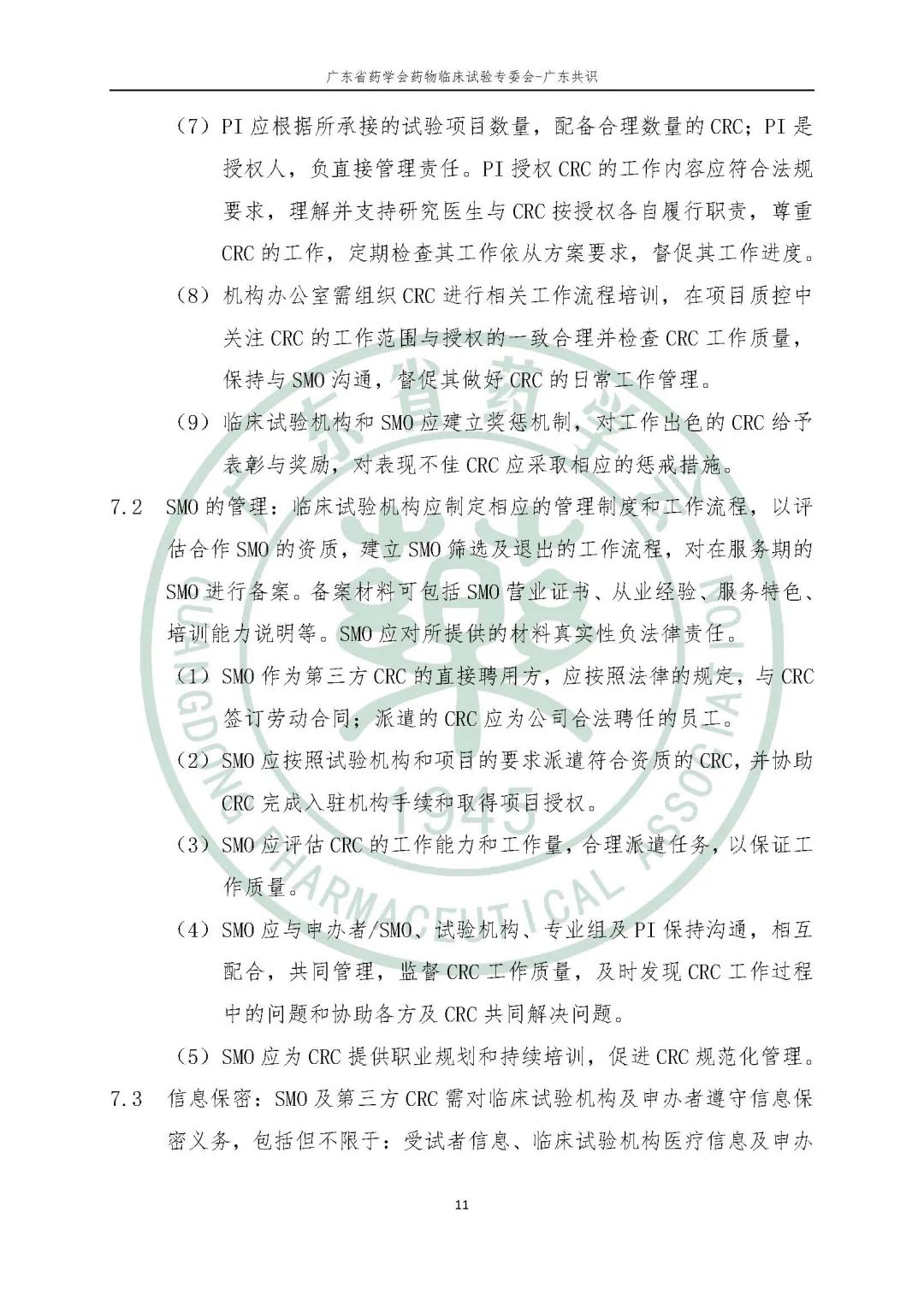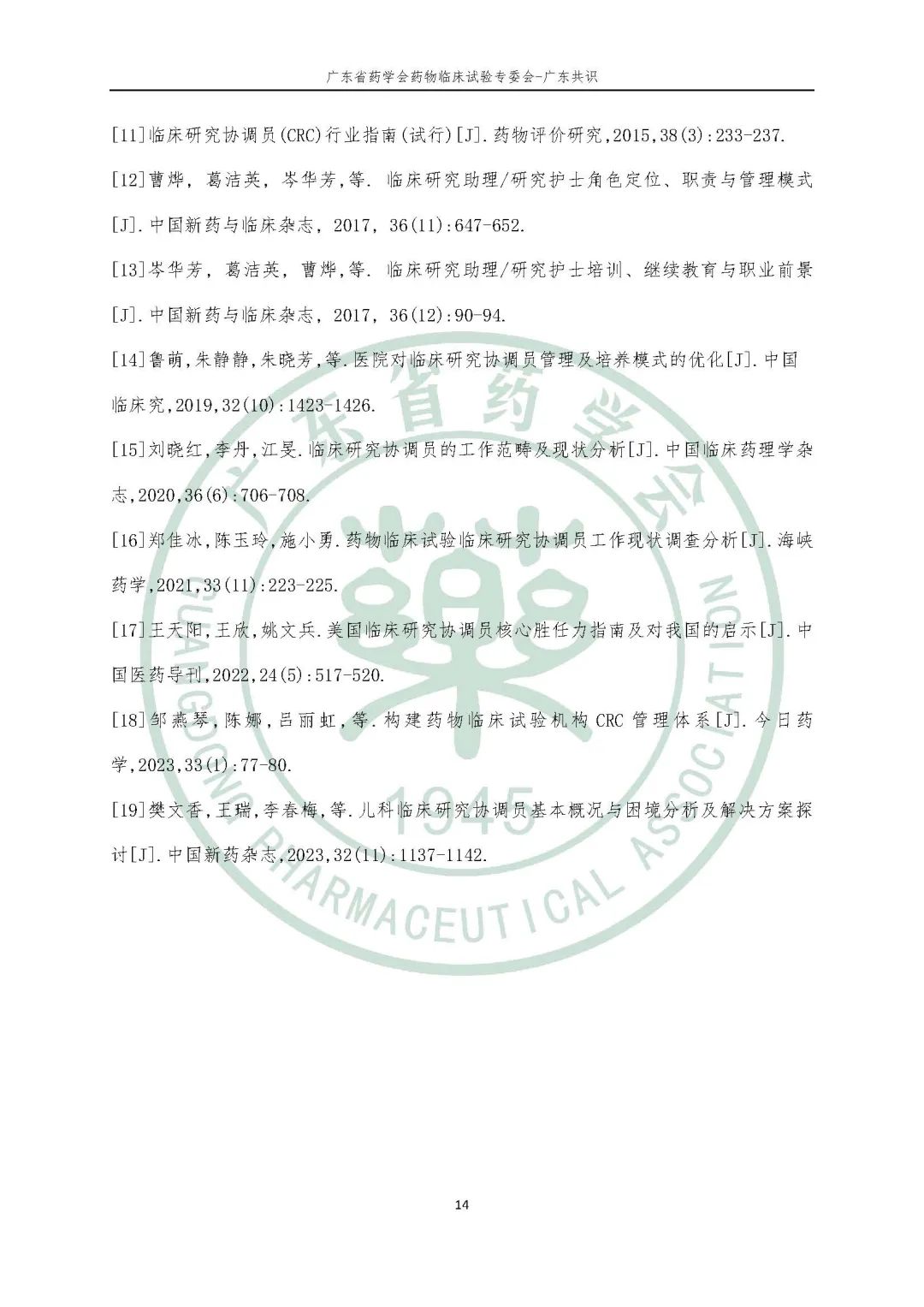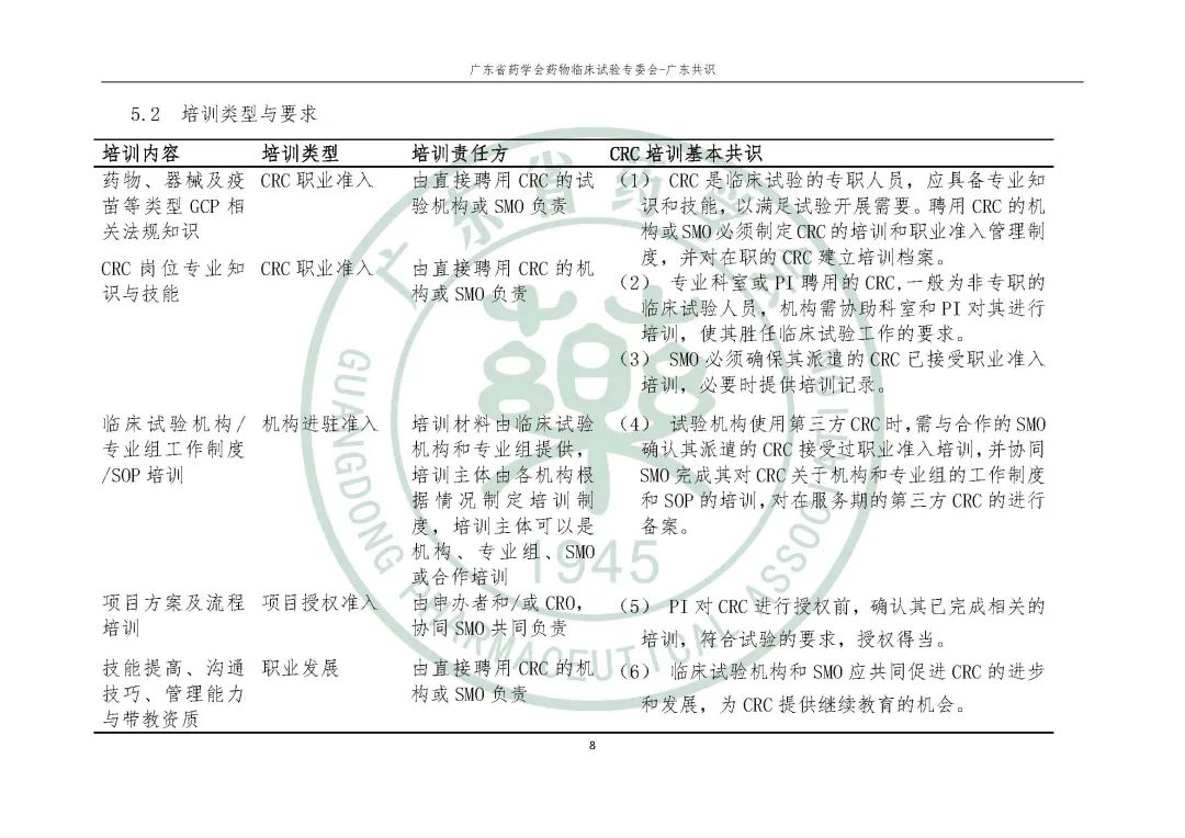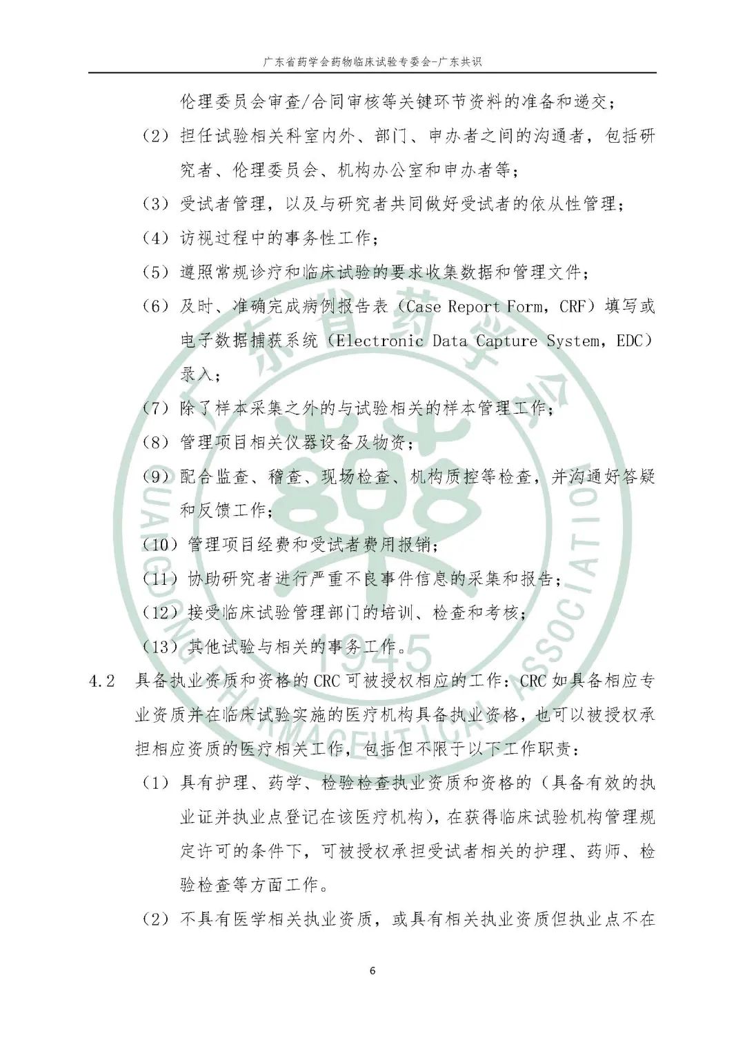 关于发布《药物临床试验 CRC管理广东共识 (2024年版)》的通知 粤药会〔2024〕92 号 发布时间:2024-07-30 各医疗机构: 临床研究协调员(Clinical Research Coordinator,CRC)作为研究团队一员,是临床试验实施过程的重要参与者。现行法律法规鲜见关于CRC的明确要求,行业内缺乏统一标准及质量控制。为规范CRC管理,广东省药学会药物临床试验专业委员会在2015年印发了《药物临床试验 CRC管理•广东共识(2014)》,并于2020年进行第一次更新。自2020年以来,CRC发展已形成行业规模,CRC的职责与任务在认识上已基本达成共识,但行业现状仍存在CRC资质参差不齐、各临床试验机构对SMO及CRC 的管理方式与要求各异、聘任方和使用方对CRC的培训与工作缺少监督、研究者对CRC职责认知不够等,这些都可能导至临床试验风险增加。广东省药学会药物临床试验专业委员会特组织专家团队对《药物临床试验 CRC管理•广东共识(2020年版)》进行了更新完善,现予以发布《药物临床试验 CRC管理·广东共识(2024年版)》,供各医疗机构参考。各医疗机构在执行过程中遇到与本共识相关的任何问题,请及时向本会反馈。 联系地址:广州市东风东路753号东塔7楼 广东省药学会 510080 联系电话:(020)37886326,37886321 传真:37886330 电子邮箱:gdsyxh45@126.com 网址:http://www.sinopharmacy.com.cn