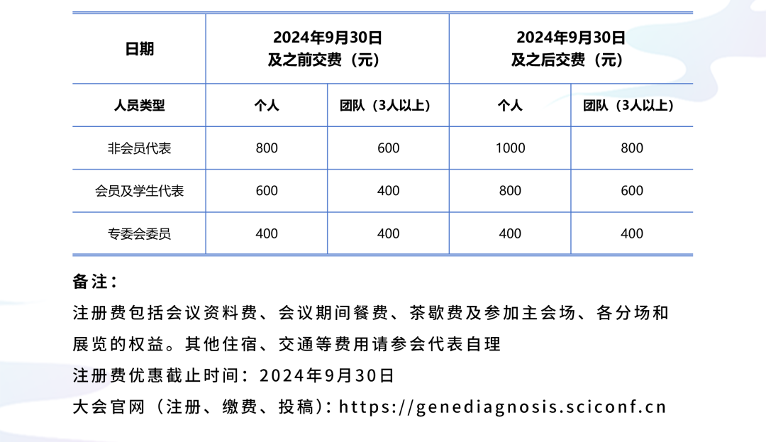 繁花绽放润基因,璀璨上海耀华章。2024年中国抗癌协会肿瘤基因诊断学术大会将于10月25-26日在上海隆重召开。 本次会议由中国抗癌协会肿瘤基因诊断专委会主办,复旦大学附属华山医院承办。大会以“整合基因数据,服务医疗健康”为理念,旨在整合基因组数据实现基因诊断,进而应用于临床实践,切实推动基础研究向临床实践的转化,探索肿瘤诊疗新途径,响应国家“十四五”规划和2035年愿景目标纲要政策号召,助力实现“健康中国”的宏伟目标! 本次会议邀请了来自全国各地肿瘤基因诊断相关领域专家,涵盖了基础医学、分子病理学、检验学、遗传学、生物信息学等多个学科的学术大咖和研究团队,以基因检测技术及临床应用为主题特设名家讲坛及多个主题论坛和技术培训班,充分展示肿瘤基因诊断及其相关领域最新研究成果,同时,为广大青年学者及研究生创造交流学习机会,助力青年学者展翅翱翔。 沪上医坛聚群英,学术荟萃共争鸣!金秋十月,邀您齐聚上海,荟萃学术精华,展望学术思潮,共享学术盛宴! 内容:肿瘤基因诊断及相关领域基础、临床及转化应用的新发现、新技术、新成果等。 要求:请按照正式发表论文的要求,撰写论文摘要(中文或英文),中文摘要500-1000字,英文摘要500-1000个单词。 备注:拟参加青年优秀论文评选的老师必须为论文第一作者,年龄需要≤45岁,所投文章必须是全文(可为已发表论文)。 1、青年优秀论文奖获奖论文第一作者免大会注册费,在大会开幕式由重量级嘉宾颁奖。 2、青年优秀论文奖获奖论文第一作者,推荐在大会进行口头告。 3、入选大会论文集的中英文摘要将收录知网并实现同步检索。 4、优秀论文奖获奖中文论文推荐至中文核心期刊《中国癌症防治杂志》,优秀英文论文推荐至Med Comm – Oncology 期刊。 2024年10月8日 请登录大会官网提交论文,大会征文一律通过大会征文系统收集,不接受邮件投稿。 论文评审结果在论文评审结束后请通过大会官网查询。 大会官网:https://genediagnosis.sciconf.cn 长按识别二维码 9月30日前注册并缴费 可享受优惠价 获取发票:本次会议注册费由中国抗癌协会开具增值税电子普通发票,内容为"会议注册费"并于会后一个月内发送至注册时预留邮箱,请注意查收。 大会官网:https://genediagnosis.sciconf.cn |