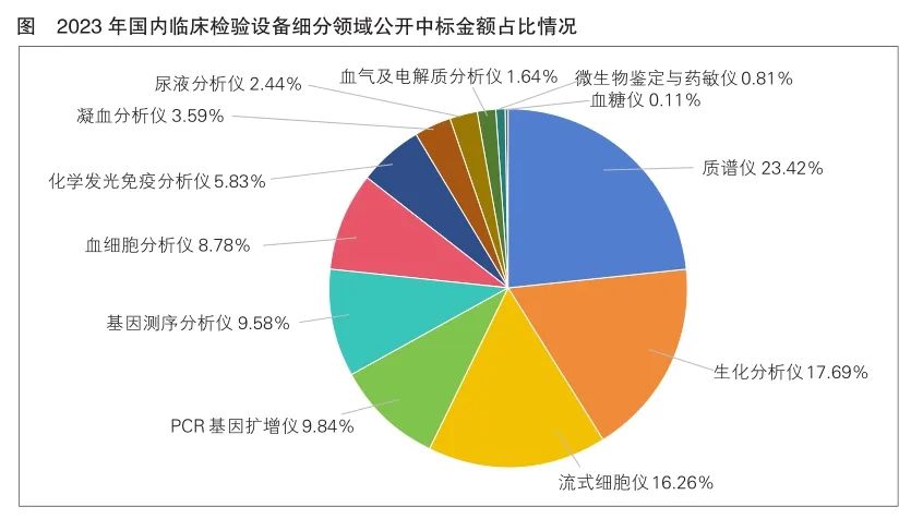 从细分领域来看,2023年我国临床检验设备公开中标金额占比较大的为质谱仪、生化分析仪、流式细胞仪三大细分领域,占比之和近60%(详见图)。