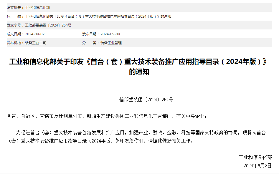 9月9日,工信部发布《首台(套)重大技术装备推广应用指导目录(2024年版)》(以下简称《目录》)。