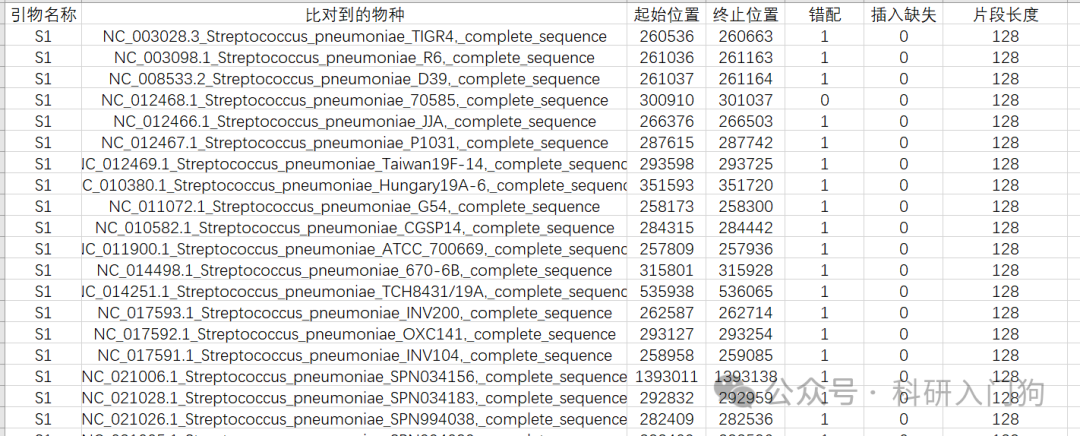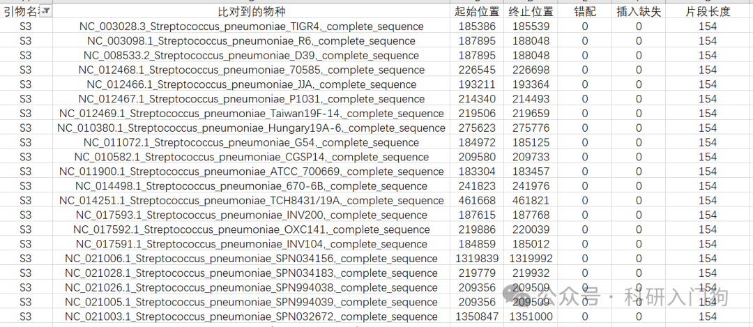 gunzip *.gzcat *.fna |sed -e 's/ /_/g' > ../all.fasta 我利用这个数据库,就可以不用NCBI,初步的知道引物的覆盖度情况,我这里设计了3对Streptococcus pneumoniae的引物,利用blastn,将引物比对到该数据库。我设置的是容许3个错配,容许1个插入缺失、片段大小范围是50-1000。最后获得如下结果,可以了解该对引物比对到该菌的数据库情况。简单的统计了S1-S3,3对引物的覆盖度情况,3对引物都可以覆盖226个亚种,但是只有S3引物没有错配,完美匹配本数据库的索引肺炎链球菌基因组。