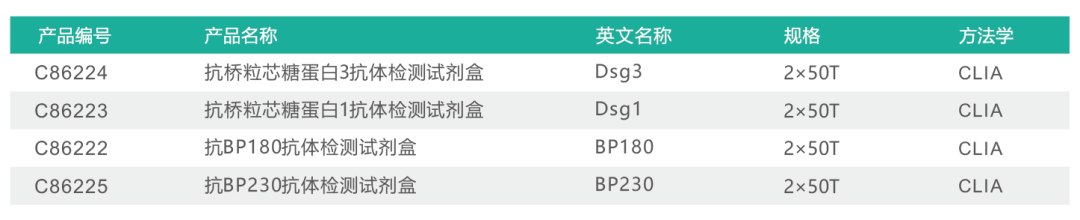 由于初期皮损表现不典型,ABSD患者误诊率高达50%-70%[3-5],尤其在非水疱期极易被误诊为皮炎、湿疹,大疱期最易误诊为单纯疱疹/带状疱疹,不同ABSD亚型间也会出现误诊的情况。对于ABSD患者,误诊可能导至病情延误,使皮损等症状持续不愈且逐渐加重,长期误诊甚至会延误最佳治疗时机,引发多种并发症,甚至危及生命。 图2 180例亚洲ABSD住院患者17年内的生存情况[7] 图3 2016-2023年复旦大学附属华山医院ABSD患者分布[6] 表1 ABSD的靶抗原 不同 ABSD 的临床表现有相似之处,需要结合不同免疫学检测技术包括直接免疫荧光(DIF)、间接免疫荧光(IIF)、ELISA、免疫印迹( IB)及免疫沉淀(IP)等来明确疾病的自身抗体,以提供准确的诊断。 (1)DIF:可用于检测病变组织和细胞中免疫球蛋白和补体的存在及分布,是诊断 ABSD 的金标准,表现为棘细胞间 IgG/IgA/C3 呈网格状沉积(主要见于表皮内ABSD)、基底膜带 IgG/IgA/C3 呈线状沉积(主要见于表皮下ABSD)、真皮乳头 IgA 呈颗粒状沉积(见于疱疹样皮炎); (2)IIF:用于检测血清中的抗体,根据检测靶抗原的不同而选择不同的底物。IIF往往与DIF表现一致,但敏感度更低; (3)ELISA:以重组蛋白或者人角质形成细胞提取物为底物检血清中抗体(Dsgl、Dsg3、BP180、BP230等); (4)IB和IP:常做确证实验。 化学发光法(CLIA)为近几十年发展起来的新一代免疫检测技术,通过化学发光反应来检测抗体-抗原复合物。在天疱疮和类天疱疮患者中,CLIA检测Dsg1、Dsg3和BP180的与ELISA的符合率高达为96%、97%和96%[9]。与传统手工ELISA相比,该技术检测时间短、自动化程度高,将有望成为检测ABSD患者自身抗体的有力方法。 |