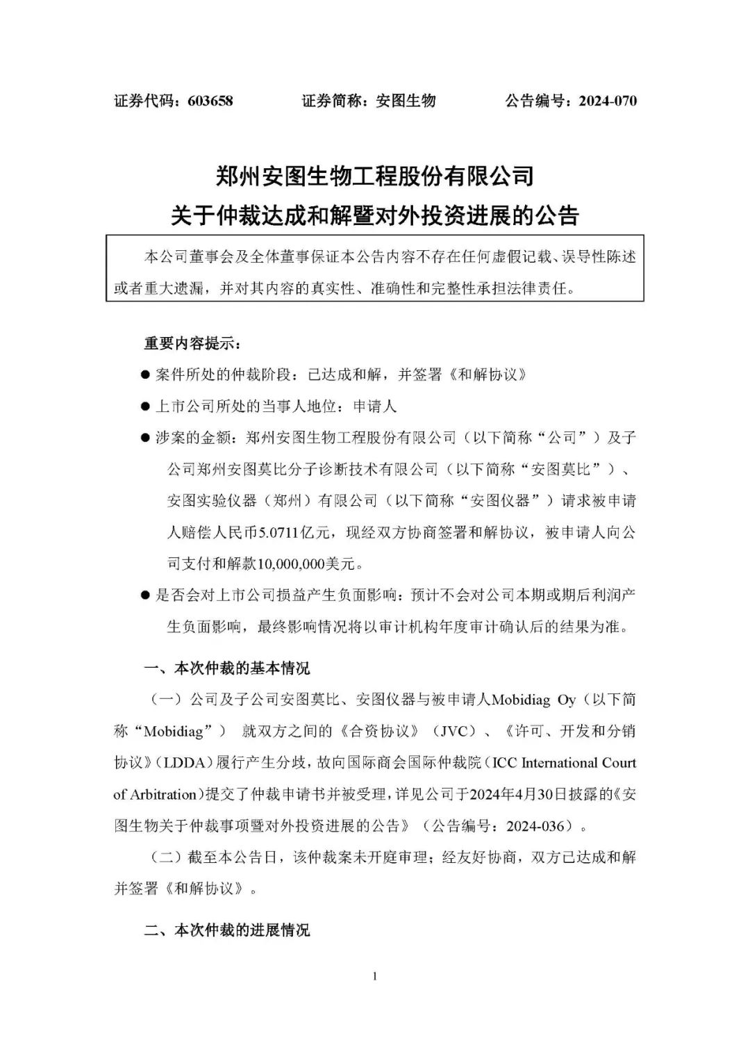 整理自安图生物 安图生物10月10日公告,公司及子公司安图莫比、安图仪器与被申请人Mobidiag Oy 就双方之间的《合资协议》(JVC)、《许可、开发和分销 具体为: 1、Mobidiag同意在《和解协议》约定的先决条件分别完成之日起的30个工作日内,分期向公司支付总额为10,000,000美元(约7000万元人民币)的和解款项。 2. 双方同意根据前期签署的《合资协议》(JVC)采取必要措施以解散和清算合资公司安图莫比。安图莫比应使用其自有资产和财产清偿其任何债务。安图莫比还应承担清算过程中产生的任何和所有成本、费用和支出。 3. 公司或Mobidiag就安图莫比的债务和负债所承担的任何责任应以其各自认缴的注册资本为限。安图莫比的注册资本已由Mobidiag(出资430万欧元持股35%)和公司(出资800万欧元持股65%)根据其各自的持股比例全额出资到位。 2018年12月15日,安图生物与Mobidiag Oy签署投资《合资合同》 2019年5月17日Mobidiag与安图莫比签署《许可、开发和分销协议》(LDDA), 2021年2月9日, 2021年11月10日,Mobidiag以电子邮件形式发出单方终止上述协议的通知。终止的理由为:安图莫比在未获得Mobidiag的事先同意的情况下进行了引物技术研发并申请专利;向安图生物披露了Mobidiag的涉密技术信息,违反了与其签署的LDDA的约定。 公司不认可上述Mobidiag终止行为的效力及终止理由。后经各方沟通无果, |