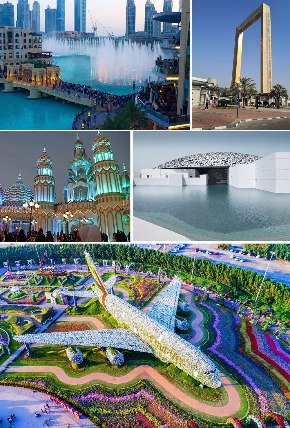 谢赫扎伊德大清真寺\法拉利主题公园\迪拜喷泉\卢浮宫\奇迹花园\地球村\黄金相框等.