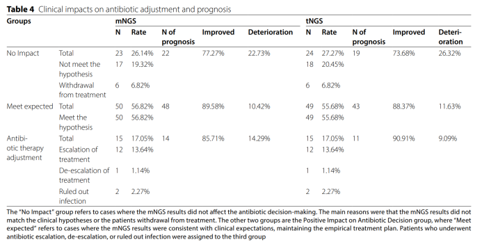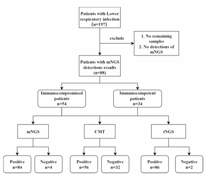 近日,上海交通大学医学院附属仁济医院的李敏教授团队在Annals of Clinical Microbiology and Antimicrobials (JCR分区Q1)发表了关于评估捕获法tNGS在免疫低下的下呼吸道感染患者中临床应用价值的研究成果。该研究基于吉因加探针杂交捕获的 tNGS panel,对下呼吸道感染患者进行了回顾性分析,评估了tNGS与临床诊断的一致性。研究结果证实tNGS技术在辅助临床诊断和提供抗感染治疗指导方面展示了其重要性和潜力。吉因加将携手仁济医院检验科分子诊断平台在未来进一步探索tNGS方法在更多临床场景下的应用潜力和价值,为该技术的广泛应用提供坚实的证据支持。 随着免疫抑制剂使用的增加,越来越多的人出现免疫功能障碍,导至危及生命的事件(尤其是感染)的风险增加,下呼吸道感染(LRTI)是全球免疫功能低下个体死亡的主要原因,由于此类患者感染的病原体的复杂性,可能需要结合各种检测方法, mNGS方法成本高,目前更常用于重症监护病房(ICU)和危重患者。tNGS方法成本效益高,前期研究表明tNGS在鉴定LRTI病原体方面表现出与mNGS相似的敏感性和特异性。因此该研究旨在通过比较tNGS与mNGS和传统的微生物检验(CMT)的性能来评估tNGS在免疫功能低下患者中辅助诊断LRTI的临床表现。 本研究回顾了197位既往就诊于仁济医院的免疫低下的可疑下呼吸道感染患者,最终纳入88名符合研究要求的患者进行分析,所有患者前期都进行了mNGS检测和传统的微生物检验(CMT)。 图1:研究设计 tNGS在所有患者中的诊断价值 首先比较了tNGS与mNGS以及CMT的临床诊断价值。以临床诊断为参考, tNGS和mNGS的诊断敏感性分别为90.48%和88.09%。tNGS与 mNGS的诊断准确性相似(88.64% 和 87.50%),但高于CMT和培养(60.23% 和 44.32%)。无论是单纯感染还是混合感染,tNGS都表现出比CMT更高的诊断一致性。 在病原体检出比较中,tNGS检测出的病原体数目最多,显著多于mNGS。这主要得益于tNGS的DNA和RNA共同检测,而mNGS仅进行了DNA检测。 tNGS不仅额外检出了RNA病毒,而且对SARS-CoV-2和甲型流感的分型结果与PCR结果一致。tNGS展示出显著优于CMT的病原体检测能力,无论是细菌、病毒还是真菌。 图2:tNGS 在 88 个样本中的诊断性能 tNGS在免疫功能低下患者中的诊断价值 在免疫低下患者中,tNGS的敏感性为94.33%,与mNGS的92.45%相当,与整体人群的90.48%相当,无显著差异。另外,与CMT比较,NGS方法的诊断准确率显著更高。 免疫低下和免疫正常患者的病原谱存在差异,细菌感染在免疫正常患者中更常见,而真菌感染在免疫低下患者中发生比例更高。与上述结果相似,tNGS比CMT发现更多的病原体(97.62% vs 44.05%,p<0.0001)。与mNGS相比,tNGS几乎发现mNGS检出的所有病原体,除了在tNGS panel之外的病原体。这也提醒我们tNGS的靶向设计会存在罕见病原体覆盖不全的风险。 图3:tNGS与mNGS 和CMT在免疫低下患者中的诊断比较 NGS 对抗生素调整的临床影响 收集了mNGS对所有的患者的病原学诊断和抗生素决策的影响。mNGS对73.86%患者的抗生素选择和决策产生了正向的影响,17.05% 根据结果进行了抗生素的升阶梯、降阶梯或者停用的调整。通过比较tNGS与mNGS的一致性,可以类比发现,tNGS可以对72.72%的患者产生正向的影响,17.05%根据结果进行适当的抗生素调整。 本研究结果表明,tNGS在免疫功能低下的下呼吸道感染患者中具有病原体诊断的潜力。tNGS的诊断性能与mNGS相当,但成本较低,因此可以作为CMT之外的一种辅助诊断的选择。 |