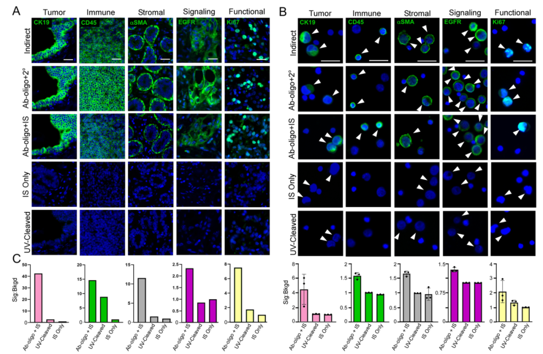 基于Ab-oligo的cyCIF依赖于在每次抗体染色后,依赖UV光从抗体上切割荧光探针,从而产生最小的细胞损失和细胞损伤。此外,基于Ab-oligo的cyCIF平台类似于质谱多路工作流程,因为所有Ab-oligo都是在一个步骤中孵育到组织上,减少了总体实验时间。 全球癌症死亡率持续居高不下,凸显了影响生存的疾病监测和检测方面尚未解决的挑战。开发一种非侵入性的、基于血液的生物标志物将改变癌症患者的生存状况。本文中作者证明了超高含量分析对新鉴定的肿瘤细胞群的功能,这些肿瘤细胞是肿瘤细胞和免疫细胞在患者匹配的肿瘤和外周血标本中的杂交细胞。作者使用允许循环免疫荧光(cyCIF)的寡核苷酸偶联抗体(Ab-oligo),提出了肿瘤和外周血杂交细胞的表型分析。有趣的是,大多数循环杂交细胞(CHC)亚群并未在肿瘤相关的杂交细胞中鉴定出来。这些结果强调了将基于Ab-oligo的cyCIF用于肿瘤和外周血标本的超高含量表型分析的有效性。多重表型分析平台(足够温和,可分析血液,以检测和评估播散的肿瘤细胞)的组合代表了一种探索新型肿瘤生物学的新方法,以及将人群开发为癌症的血液生物标志物的潜在效用。 为了确定肿瘤相关杂交细胞和循环杂交细胞之间是否存在一致的表型,作者首先在患者匹配的肿瘤组织切片和肿瘤切除时采集的外周血样本中确定了深度表型的杂交细胞。作者利用cyCIF进行了多轮抗原染色和成像,并在轮间温和地去除信号,证明这些信号与外周血分析兼容。为了建立混合细胞表型Ab-oligo组合,作者从5个离散类别中选择了抗原:肿瘤表达、免疫细胞、基质、细胞信号传导和功能,以便分析相对于离散肿瘤标志(基质、免疫)的混合细胞特征(即增殖、细胞信号传导状态、表型/功能)。生成相应的Ab-oligo后,作者证明,与常规间接抗体染色(即使用结合荧光团的一抗-二抗)和常规二抗染色检测到的Ab-oligo偶联物相比,每种Ab-oligo (即Ab-oligo+IS)在肿瘤组织中具有一致的染色模式(下图A)。 图注:来自五个表型类别:肿瘤、免疫、基质、细胞信号和功能的代表性生物标志物的Ab-oligo验证 此外,作者评估了Ab-oligo + IS与单纯IS处理的组织以及Ab-oligo + IS染色组织经紫外线处理后的信号背景比。在所有病例中,特异性Ab-oligo信号与背景的比值均大于对照组(即大于1)(上图C)。接下来,作者在一个外周血-人癌细胞系模型上验证了Ab-oligo染色模式,该模型将Ab-oligo添加到从健康受试者分离的外周血单个核细胞(PBMCs)中,以评估抗体对肿瘤或免疫细胞的特异性。与肿瘤组织染色的结果一致,相对于间接抗体染色和Ab-oligo +二抗,Ab-oligo显示出相同的染色模式(上图B)。此外,除VWF不能染色外,所有Ab-oligo + IS组的信号/背景比均大于对照组(即大于1)。 为了在患者匹配的肿瘤和外周血中鉴定杂交细胞,作者将针对CD45(一种泛白细胞标志物)的一小组Ab-oligos,以及含有针对EpCAM、ECAD和泛细胞角蛋白(panCK)的Ab-oligos应用于CRC和PDAC肿瘤组织以及匹配的分离的PBMCs。利用这一组合,作者在CRC和PDAC样本的原发肿瘤和外周血中发现了大量杂交细胞(如下图)。 图注:肿瘤组织和外周血杂交细胞鉴定 接下来,作者在另外三轮染色中对患者匹配的样本应用了经过验证的Ab-oligo组合,以从杂交细胞获得更多的表型信息。在第一轮中,杂交细胞被鉴定出同时表达CD45和至少一种上皮标志物(ECAD、EpCAM和/或panCK)(如下图,第一轮)。在每一轮Ab-oligo染色之间,作者用紫外线处理标本,并重新扫描组织,以确保在进行下一轮染色之前完全清除荧光信号。另外,免疫组织化学染色包括:第2轮(CK19、Ki67、pAKT、CD44);第3轮(CK8、VIM、EGFR);第4轮(CK7、αSMA、VWF)。为了将所有的染色叠加到一张图像中,作者使用QiTissue(一个多重图像可视化和分析软件包)或基于特征的图像配准。这使得作者能够在肿瘤组织和相应的外周血标本中鉴定杂交细胞并对其进行表型分析(如下图)。 图注:在患者匹配的结直肠癌(CRC)和胰腺癌(PDAC)肿瘤切片和血液标本上进行四轮cyCIF鉴定和表型杂交细胞 参考文献: Whalen RM, Anderson AN, Jones JA, Sims Z, Chang YH, Nederlof MA, Wong MH, Gibbs SL. Ultra high content analyses of circulating and tumor associated hybrid cells reveal phenotypic heterogeneity. Sci Rep. 2024 Mar 28;14(1):7350. doi: 10.1038/s41598-024-57381-8. PMID: 38538742; PMCID: PMC10973471. 杭州乐为生医公司 杭州乐为生医公司可提供抗体寡核苷酸偶联技术服务及成品试剂盒。助力您在实验室条件下即可轻松实现Ab-oligo的高效偶联。 技术支持联系电话:18611591243 销售联系方式:19957893538 |