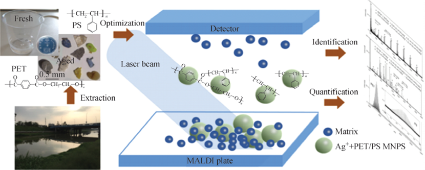 微塑料的溯源存在许多问题,缺乏系统的研究。稳定同位素比质谱(IRMS)可以有效地研究环境中微塑料的源头,有利于微塑料污染的控制。Birch等利用稳定碳同位素比质谱、衰 减全反射傅里叶变换红外光谱(ATR-FTIR)和微拉曼光谱 比较了食品包装、容器、吸管等塑料制品。利用IRMS证明了植物源聚合物和石油基聚合物的13C比值存在差异,来 自不同国家的具有相同聚合物组成的塑料制品的13C比 值存在差异。此外,IRMS还可区分暴露于紫外光老化前后的塑料。基质辅助激光解吸飞行时间质谱(MALDI-TOF-MS)是一种可用于微纳塑料颗粒定性、定量的重要分析技术。Wu等建立了表征环境样品中PS 和 PET 微纳塑料颗粒的方法, 示于图6。图6 MALDI-ToF-MS分析环境中的微塑料