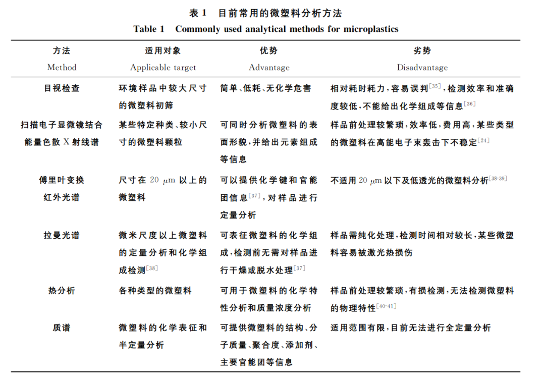 FTIR是一种可以提供样品化学键和官能团信息的振动光谱技术。微塑料偶极矩的变化产生红外光谱,通过与光谱库中已知的聚合物标准光谱进行比较,即可确定微塑料的化学成分。FTIR有光谱反射、透射和衰减全反射3种模式,可根据样品特点和操作方式灵活选择。FTIR在分析微塑料方面具有诸多优势:1)FTIR 是一种非侵入性分析方法,对样品的破坏较小[46];2)FTIR的预处理过程相对简单,不易受样品中其他物质自发荧光的干扰;3)FTIR具有环境友好等特点。FTIR 广泛应用于微塑料的定性、定量分析,但受限于其分辨率,仅适用于分析20μm 以上的微塑料。此外,FTIR易受微塑料的异质性、老化程度等因素的影响,较难分析不透明或黑色微塑料等。拉曼光谱法的主要原理是当激发光照射到样品时,少部分光子与样品中的分子和原子发生碰撞和能量转移,由于样品中不同分子和原子的结构不同,导至散射光出现不同的频率,从而产生拉曼位移。拉曼位移的程度与分子结构密切相关,因此可以得到指纹图谱,通过与标准图谱比对即可确定样品成分。该方法具有无损、抗水分子干扰、所需样品量少、环境友好且可实现高通量分析等优点。此外,拉曼光谱可以与光学显微镜组合,绘制整个样品区域的高分辨成像,可检测1μm 以上的微塑料颗粒,因此其适用范围比FTIR更广。但通常拉曼光谱所需的检测时间较长,不能用于荧光物质的检测,且微塑料中的添加剂和吸附在微塑料表面的污染物产生的拉曼光谱可能与微塑料的拉曼光谱重叠,从而干扰对微塑料的识别,因此,在实际样品检测中受到一定限制。聚合物质谱分析可以提供聚合物及其添加剂的结构、分子质量、聚合度、元素组成、主要官能团以及末端结构等重要信息。质谱还可以与其他方法结合分析微塑料的成分和聚合物类型。目前,用于分析微塑料的质谱技术主要包括热分析气相色谱-质谱、液相色谱-质谱、单颗粒电感耦合等离子体质谱、基质辅助激光解吸飞行时间质谱、二次离子质谱等。4.1 热分析质谱法