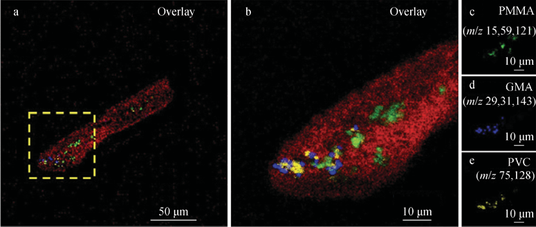 飞行时间-二次离子质谱(TOF-SIMS)是一种具有高灵敏度、高分辨率的表面分析技术,可以对微米级尺度的样品进行成像分析,近年来逐渐应用于环境分析领域。TOF-SIMS 利用高能离子束撞击微塑料,将聚合物以碎片离子形式从表面解吸,确定塑料的特征碎片离子, 从而反映微塑料的化学组成,并可根据特征离子的成像结果进一步了解微塑料的大小和分布情况。Du等利用TOF-SIMS表征农田土壤中的 PP、PVC、PET 和 PA 4 种微塑料的颗粒大小和丰度。由于微塑料的检测容易受土壤中存在的天然有机物的干扰,因此,需要将微塑料从土壤中分离提取后再进行测定。在使用TOF-SIMS分析微塑料时,不同种类微塑料的碎片离子非常复杂,难以区分,可以先从微塑料的标准样品中获得典型的碎片离子信息,以确定每种微塑料类型的特征离子,再进行质谱分析或成像。