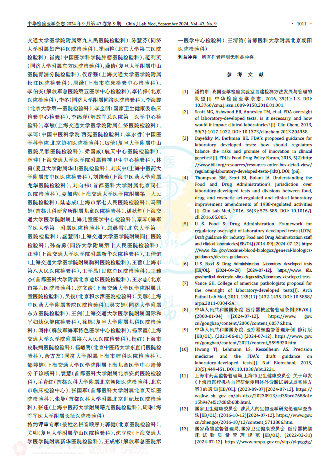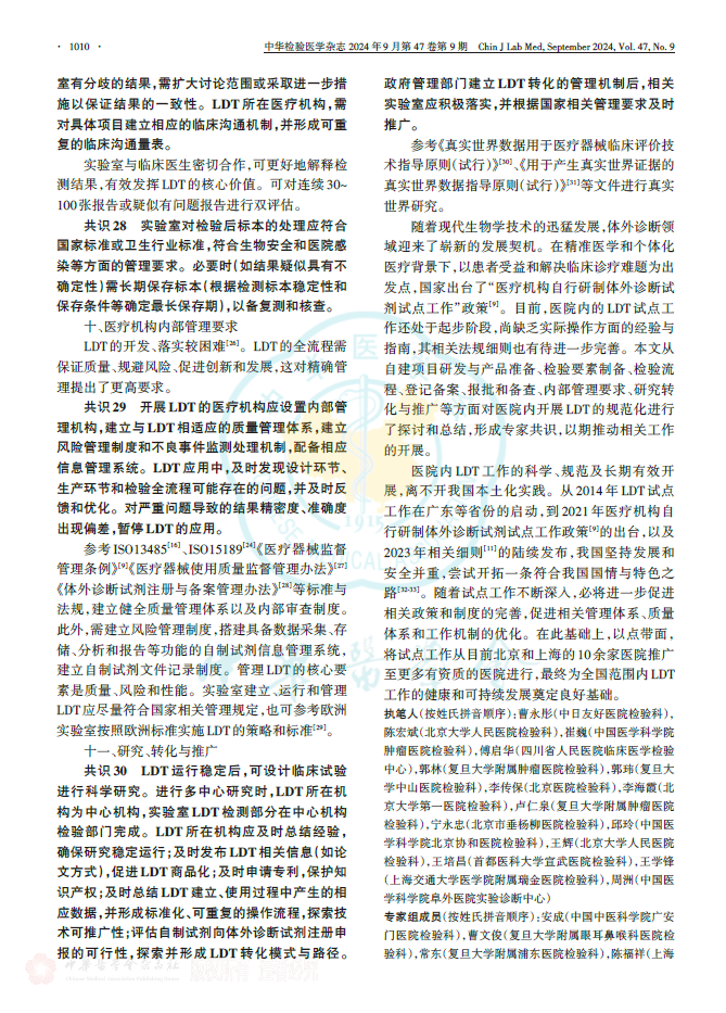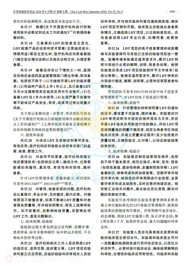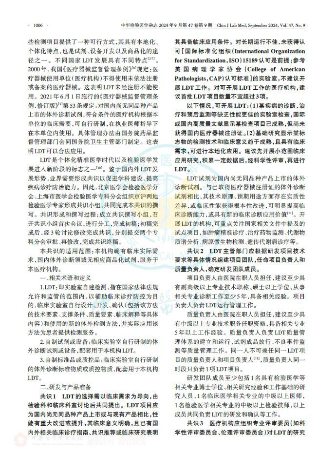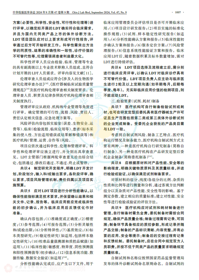 伴随临床医学和检验医学的不断演进,医疗机构对实验室自建检测方法(包括自制试剂等)的流程与管理规范化的需求极为迫切。该共识以自建检测的质量、风险、性能三大核心关键要素为基点,围绕术语阐释、研发与产品准备事宜、检验流程设计、登记备案要求、督查举措、检验前中后环节要点、转化应用以及推广等内容,给出了具有共识性的建议,期望能为医疗机构开展相应工作提供有益参考。 主要共识如下: 共识1: LDT的选择需以临床需求为导向,由检验科和临床科室讨论后共同提出。LDT项目应为国内尚无同品种产品上市或与现有产品相比,性能有重大改进或提升,其临床意义明确,且已有国内外相关临床诊疗指南、共识推荐或临床研究表明其具备临床应用条件。对长期运行不佳、未获得认可[国际标准化组织(International Organization for Standardization,ISO)15189认可是前提;参考美国病理学家协会(College of American Pathologists,CAP)认可标准]的实验室,不建议开展LDT工作。对可开展LDT工作的医疗机构,建议首批LDT项目数量不宜超过3项。 以下情况,可开展LDT:(1)某疾病的诊断、治疗和预后监测等缺乏性能更佳的实验室检查,国际或国内高质量文献显示某检查项目已成熟,但尚未获得国内医疗器械注册证。(2)基础研究显示某标志物的检测技术和临床意义趋于成熟,且具有临床需求,可进行本地化应用。建议先开展小范围临床应用研究,积累一定数据后,经科学性评审,再进行LDT。 共识2: LDT主管部门应根据研发项目技术要求等具体情况组建项目团队,任命项目负责人和质量负责人,确定研发团队成员。 共识3:医疗机构应组织专业评审委员(如科学性评审委员会、伦理评审委员会)对LDT的研究方案(必要性、科学性、安全性、可行性和伦理等)进行评审,以确定拟开展的LDT确实符合临床需求,并且为国内无同类产品上市的体外诊断方法。LDT项目团队应对以上要求形成可行性报告,评审通过后方可开始研发工作。科学性需突出方法学的同质性、结果的准确性和一致性、诊疗价值的不可替代性等,伦理需强调患者利益最大化。 共识4:制定研究开发程序,明确LDT开发计划,阶段划分,输入和/或输出要求,各阶段评审、确认要求,项目风险管理机制,责任归属以及项目实施预算。 共识5:应对LDT项目进行分析性能确认,以确保性能指标满足技术要求,并保留确认结果和相关文件、记录、报告等。临床应用前应完成临床性能的初步确认,并为临床应用后反馈优化作好准备。 共识6:LDT项目选择及流程建立后,需分别进行临床应用评审,以确认IDT对临床诊疗具有不可替代价值。LDT项目负责人应主动与临床医生进行2轮及以上定期沟通(如早期每月,后期每季度、每年)。无实际临床应用价值的检测项目,则不能启动LDT。 共识7:医疗机构可自行制备检验试剂或耗材,也可在研发定型后委托具有医疗器械生产许可证且生产范围包括第二类或第三类体外诊断试剂的企业完成制备。受委托企业获批的产品类目需与LDT一致。 共识8:应根据原材料对产品性能、安全等的影响程度,明确关键物质原料及其质量标准,并进行检验或验证,以确保满足试剂制备要求。 共识9:医疗机构应对试剂和耗材制备进行管理,自行制备时需负全责,委托制备时需按合同规定,确保产品质量合格;制备过程需有记录、可回溯;制备环节具备相应的质控参数,形成记录并随产品交接;制备的产品标识清晰、内容完整,并有必要的应用、安全等提示;制备后的交接过程有记录和反馈机制。委托制备时,应在合同中规定双方人员职责,并按不低于同类产品的质量要求明确规定质量标准。 共识10:关注标准品、校准品、质控品、参考品等的制备。制定不同级别相应产品的量值溯源程序,建立制备和交接记录。 共识11:对配套LDT使用的自制设备需设立相应标准以确定自制设备性能,并可满足LDT工作需要。自制设备所需材料和制备过程,具备可及性和可操作性;并充分考虑其运行所需的水、电、气等供给条件和环境条件;充分考虑其成本、安全、伦理等要求以及安装条件。操作步骤简便明确,操作界面宜清晰。如应用已投产设备,则该设备应具有相应的医疗器械注册(备案)证。 共识12:编制管理文件、规范化操作规程、记录文件等,设定质量目标和测定允许误差,建立质量管理体系。 共识13:配备本阶段的LDT项目负责人、质量负责人、工作人员要求见共识2,设备要求见共识11。需关注安全性(风险评估前瞻而充分,意外事件处理理智而果断,损失最小化),性能(反复判断是否符合预期目的),非预期事件(深入分析、充分归纳、及时反馈)。试剂耗材要求见共识8~10。 共识14:建立防范LDT风险的管理机制,建立不良事件预估和发现机制,增强风险防范和处置能力。对实验室工作过程和可能存在的问题进行危害识别、风险评估,并实施必要的控制措施,以降低或消除风险。 共识15:检验流程建立后,应对LDT性能、配套产品性能等进行研究和评价,至少包括分析性能、稳定性、阴性和阳性判断值、质量控制程序、参考区间等。评价频率:分别评价前3个批号配套产品的性能,如均符合预期,可改为年度评价;如不符合预期,则不能启动 LDT应用。 共识16:LDT实际应用前需进行登记备案按照国家和地区设定的登记备案要求,向所在地的省级药品监督管理部门提交备案资料。项目团队对技术进行具