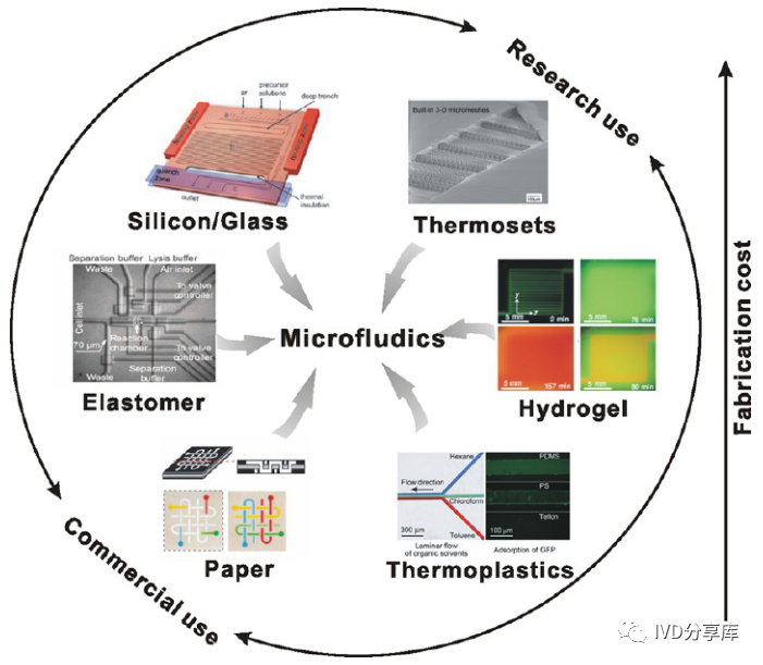 芯片材料的发展反映了微流控技术的两大趋势:强大的微尺度研究平台和低成本、便携的分析。对于实验室研究,选择材料通常需要兼顾原型制作的便利性和设备的性能,而在商业化过程中,主要关注的是生产成本以及使用的易用性和可靠性。这种差异会导至对微流控器件制造材料选择的不同偏好。目前,玻璃、硅和PDMS最常用于实验室的研究,而塑料和纸张更有希望用于商业设备。每种材料都有其优点和缺点。玻璃、硅和聚四氟乙烯是对化学品和溶剂最惰性的材料;PDMS易于原型制作和制造具有各种集成组件的复杂流体回路;普通热塑性塑料非常适合标准微流体装置的商业批量生产;水凝胶更适合生物应用;纸在商业一次性生物测定方面很有前景。最后,所有材料都可以进行修改或组合,以制造更强大的设备来满足特定目标。参考文献: