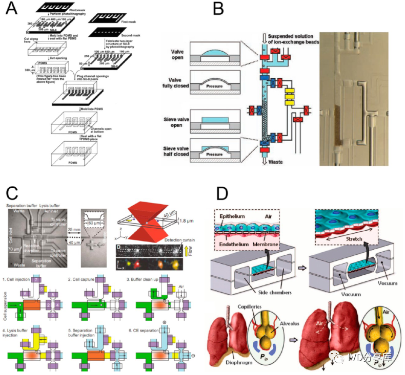 (C)高温转移模塑法热塑性塑料的微细加工;(D)完全使用聚四氟乙烯PFA制造的微流控芯片。