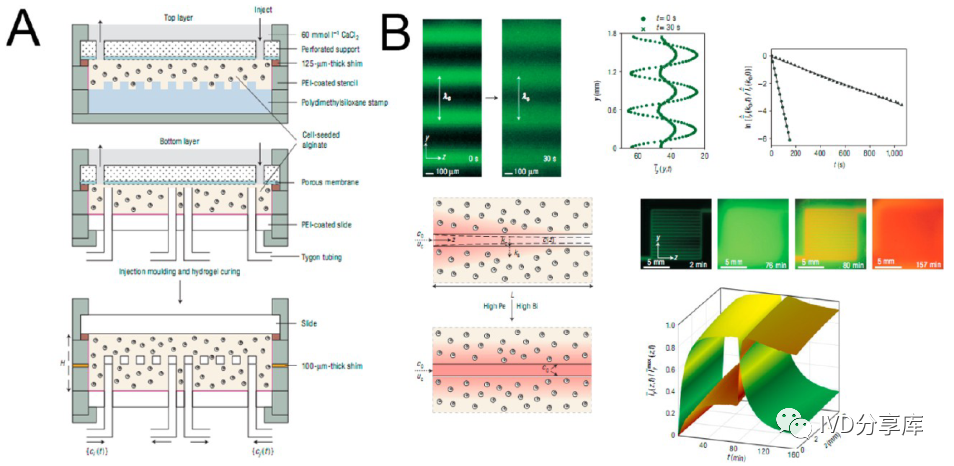 (A)在海藻酸钠凝胶中制备的微流控器件,嵌入细胞用于培养;(B)分子通过通道壁扩散到海藻酸钠凝胶中。