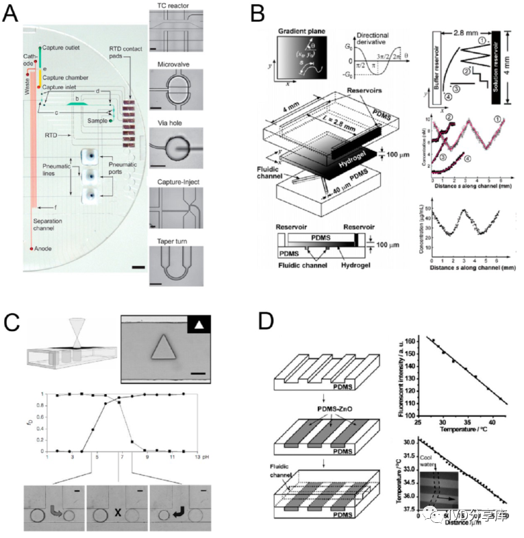 (A)集成阀和电极的玻璃-PDMS混合芯片;(B)用于梯度生成的PDMS-水凝胶混合芯片;(C)原位光固化水凝胶结构作为pH敏感阀,用于自动流量操作;(D)PDMS-ZnO复合材料作为PDMS芯片上的原位温度传感器。