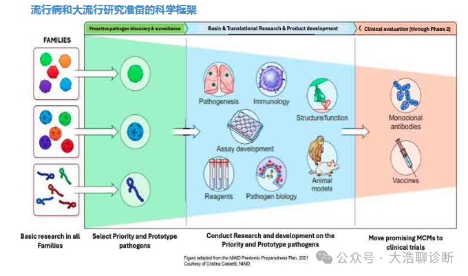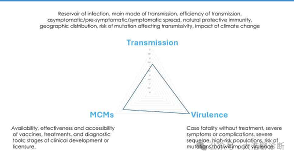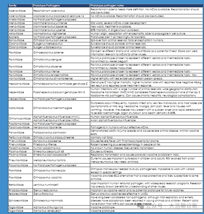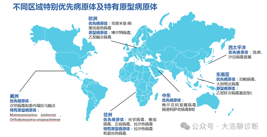 前 言 世界卫生组织于2024年7月30日更新发布,病原体优先排序:流行病和大流行研究准备的科学框架的文章《Pathogens prioritization: a scientific framework for epidemic and pandemic research preparedness》。 文章研究涉及来自50多个国家的200多名科学家,这些科学家评估了与28个病毒家族和一个核心细菌组相关的证据,其中包括1652种病原体。 问题与反思: 病原体优先排序:未来需要关注的病原体 文章首先介绍了2017、2018与2024年优先考虑病原体的更新情况。 其次是每个专家小组对于病原体优先级的排列过程的概述。第一次会议上,专家们审查了病原体家族中的最初病原体清单,并剔除那些被认为(根据目前的知识)仅有非常低可能引发大流行或者是无法引起流行病或大流行的病原体。第二次专家裁决,需要全面的评估,以确定每种病原体是否值得纳入以下两类之一。第一类:如果有大量证据表明其有高传播性和毒力,如果不加以控制,能够引发国际公共卫生紧急事件(PHEIC)或大流行。第二类:虽然现有证据不足以支持成为第一类,但足以引起关注并可能符合病原体X的资格的病原体。 第三,每个专家小组的参与者都完成了对每种剩余病原体的筛查后调查,其中包括补充询问和扩展的评估部分。参与者都被要求提供每种病原体的风险评估,同时考虑到引发国际公共卫生紧急事件(PHEIC)或大流行的可能性,具体如下评估其传播能力、毒力和可用性对策。 评估后采用从1到5的评级(表示风险非常低到非常高)或“数据不足”来做出判断。随后,专家小组的成员列出如下类别的病原体,以下是提供的其分类及定义。 1.优先病原体家族:根据世卫条例的规定,在病原体家族中至少含有一种会引起国际公共卫生紧急事件(PHEIC)或流行病的病原体。2.优先病原体:通过分析其传播模式、毒力、可用性对策即现有知识表明,病原体可能导至国际公共卫生紧急事件或者大流行出现。3.原型病原体:每个病原体家族中具有代表性的病原体会被选为基础研究和转化研究的模型,通过对其研究可以开发应用于该家族其他病原体的可用性对策。4.病原体X:病原体并不足以是国际公共卫生紧急事件的威胁,但是鉴于其生物学和当前传播力和毒力的变化,其在未来可能成为病原体X。 那么上述的分类是如何来的?可以参考下图,其为进行分类时所采用的标准与级别。 病原体家族会分为:高风险(病原体家族中多个确定的优先病原体)、中风险(病原体家族中至少有一个优先病原体)、低风险(病原体家族中不确认有优先病原体)以及不确定风险(没有足够数据)。优先病原体:根据现有知识、传播模式、毒力和可用性对策判定上述是有或无亦或未确认进行分类。原型病原体:其为在病原体家族中是否有还是不确认有,代表性的病原体可以被选择出来作为基础研究和传播模式研究以及发展可用性对策的病原体。 总体而言,专家组审查来自8个DNA病毒家族、19个RNA病毒家族和5个细菌家族的证据。根据其携带能够引起国际公共卫生紧急事件或流行病的优先病原体的能力进行分类。 接着根据定义为不同病原体家族分类以及其引起国际公共卫生紧急事件的风险评估,最后还包括对于这一病原体家族的说明。 后续对流行和大流行研究的科学框架进行描述。首先对病原体家族进行研究,挑选出优先病原体和原型病原体,进行发病机理、免疫学、诊断试剂、病原生物学等研究,再将其可用性对策(如疫苗和单克隆抗体)进行临床测试。 因此根据上述的分级,最终出具病原体家族及优先病原体,并且根据地区分布进行了标记。并附上引起国际公共卫生紧急事件的风险的等级评估和优先病原体注意事项。 对原型病原体也按地域进行更新和风险评估并进行记录。 此外,在所有六个地区都存在属于低风险病毒家族的几种原型病原体,例如,人型偏肺病毒和轮状病毒。 如上图所示在全球不同的区域,优先事项可能会有所不同,因为许多病原体仅限于特定地理区域,或是多个特定地理区域。为了促进每个地区的研究,有针对性的研究当地相关的原型病原体就显得尤为重要。例如对于许多病原体家族来说,单一的原型病原体被认为足以覆盖整个病原体家族。 然而对于另一些病原体家族而言,如果潜在的原型病原体被限制在某些地区或由不同的媒介传播,则有必要选择多种原型病原体进行研究。 非洲地区 非洲地区的特别优先病原体:包括丝状病毒(扎伊尔型埃博拉病毒、苏丹型埃博拉病毒和马尔堡病毒)、猴痘病毒、正痘病毒和拉沙热病毒。 其他包括所有三种优先的病原体(登革病毒、乙型脑炎病毒和寨卡病毒)和基孔肯雅病毒。在全球病原体中,Lentivirus humimdef1具有特别重要的意义。 另外细菌优先病原体在该地区也很重要包括,霍乱弧菌O139、鼠疫耶尔森菌、痢疾志贺菌血清型1、非伤寒沙门氏菌(侵袭性)、肺炎克雷伯氏菌。而拉沙热病毒和裂谷热病毒,则是非洲地区特有的原型病原体。 美洲地区 美洲地区特有的特别优先病原体:汉坦病毒和委内瑞拉马脑炎病毒。所有三种优先的病原体(登革病毒、乙型脑炎病毒和寨卡病毒)都是该地区的常见的流行病。 美洲地区特有的原型病原体:Mammarenavirus juninense、 Orthobunyavirus oropoucheense.这两种病毒(实在是找不到中文翻译,有的话大家可以提供给大浩) 中东地区 中东地区的特别优先病原体为:梅尔贝科亚属病毒(Subgenusme