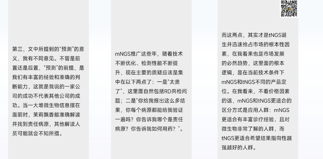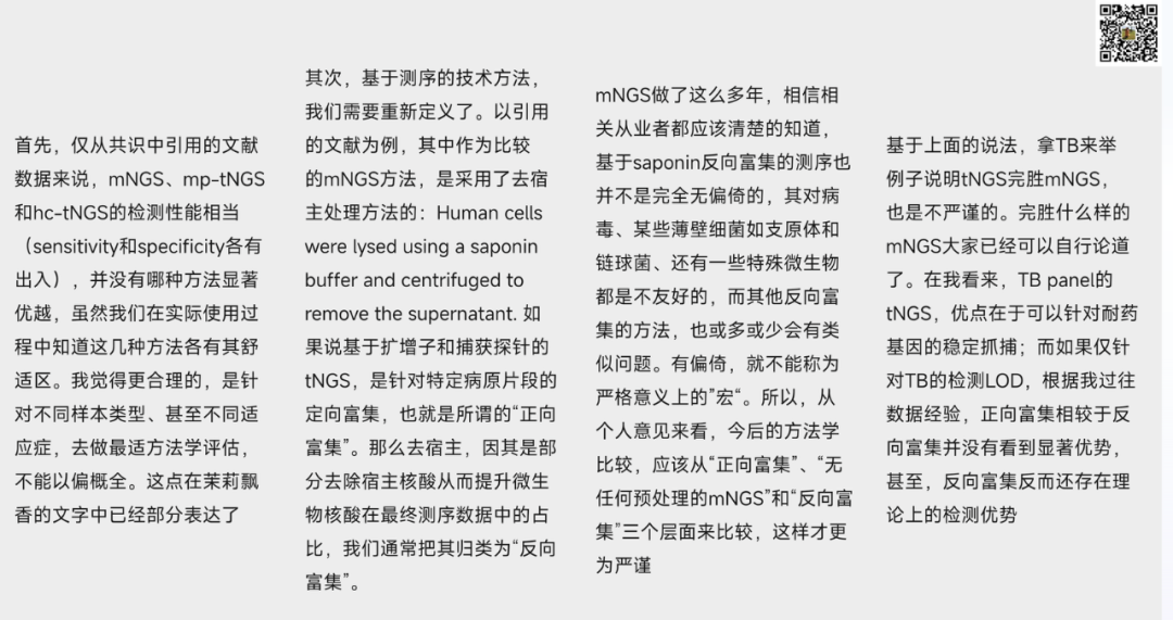 所以,我们一开始做tNGS产品定位时,称其为“更接近临床微生物感染真相”的高通量测序产品。 这样的产品其实挺考验设计者对不同微生物生物特性的理解,以及对人体各系统感染不同特点的认知和理解。 我举一个印象很深刻的例子: 既往在mNGS的临床实践中,我们常在肺炎患者的BALF或者痰液样本里检出肠球菌。但实际上,迄今为止我们在文献中尚未有任何符合科赫法则的证据证明肠球菌肺炎。 在设计tNGS呼吸道panel的病原范围时,我和研发就是否纳入肠球菌曾激烈争论。 我的观点多少带着医生背景的“偏执”: 抗生素耐药和不合理使用迄今仍是全球公共卫生的困局和负担,因此作为一个试图“更接近特定部位感染病原真相”的产品,我们要解决的是相对常见的、覆盖绝大多数感染病原诊断。 在这个前提下,如果在呼吸道panel中纳入肠球菌,会不会造成临床误解,甚至增加临床针对耐药G+抗生素不合理使用呢? 同理,在适用咽拭子样本的上呼吸道的panel中,纳入结核分枝杆菌复合群是否必要? 如果咽拭子样本检出结核,是否真阳性? 同样,如果咽拭子样本检出念珠菌是否有临床意义呢?我们每个人的口咽部都存在念珠菌定植啊! 所以,我一直在各种场合建议tNGS不应该是“小宏基因”,tNGS不应该“一个panel适用全样本类型”的原因也在于此。 很高兴看到,今天发布的tNGS检验专家共识也是认同该观点的。 02 探针捕获是mNGS 2.0吗? 首先恳请友商不要揍我,这纯属科学技术探讨哈! 这次发布的专家共识将探针捕获NGS定义为tNGS中的一种。 同时也充分肯定了探针捕获NGS较多重PCR引物扩增子NGS具有更好的兼容性,覆盖基因组范围更大、更广谱。 这也是为何在探针捕获NGS诞生之初有被定义为“mNGS2.0”的很重要原因。 如果是百万级别探针捕获,且病原设计充分考虑到种、属、保守序列以及SNP覆盖,甚至有些基因组小的RNA病毒全基因组覆盖,加上磁珠的非特异性捕获,的确也是可以说其覆盖范围可以等同mNGS的。 但就像我前面说到的,tNGS区别于mNGS的核心是把“预测”前置到设计环节。 即使是百万探针,其性能也不是均一的。 其捕获性能较好的,或者说发挥了捕获正向富集作用的,仍然是探针打靶重点覆盖的、既往mNGS数据积累的、在临床样本检出过的那几千种微生物。 这,已经是一种预测。 因此,从这个角度而言,定义为tNGS也是合理的。 03 多重扩增 or 探针捕获? 这个问题的答案在不同临床场景下是不一样的。 过去3年,多重PCR引物扩增子tNGS是率先起步的,因此其发展也更为成熟。 以应用最广的上呼吸道和下呼吸道panel为例,诞生至今可以说经历过无数次临床感染和微生物专家鞭打和教育。 所以,扩增子tNGS不管是病原范围、引物设计还是生信分析都相对成熟。 目前常见的呼吸道tNGS的标配就是可同时检测RNA病毒和DNA病毒,并且panel覆盖上既包括了导至呼吸道感染的常见病原,也纳入了免疫缺陷患者呼吸道感染可见的真菌、NTM和部分胞内病原。 在我看来,98%的临床呼吸道感染的病原诊断使用多重扩增tNGS已经可以满足临床需要。 在呼吸道之外,中枢神经系统、生殖系统、消化道系统感染以及真菌感染也有相应的扩增子tNGS产品,但因为临床应用的量还较少,期待更多研究验证其性能。 而探针捕获tNGS实则在mNGS基础上增加了磁珠捕获,因此其在特定场景中优势相当明显: 比如对cfDNA打靶较扩增子tNGS更友好。 再加上病原覆盖范围更广,所以在解决中枢神经系统和血流感染的场景中,探针捕获tNGS是能解决这两个场景目前病原诊断痛点的产品。 有小样本研究发现,在初步诊断脓毒症的患者外周血样本中,探针捕获tNGS仅1M数据量,其病原检出的敏感性就远远超过了100M数据量的mNGS。 临床上社区获得性脑膜脑炎、不明原因发热、感染性心内膜炎、脓毒血症等都是探针捕获tNGS更合适的应用场景。 “橘生淮南则为橘,生于淮北则为枳” 再好的产品,也得放在正确的临床场景中才能起到“正向”的助益。 这一点不管对于扩增子tNGS还是探针捕获tNGS,都是一样的。 04 mNGS会被tNGS替代吗? 虽然我参与了tNGS对mNGS的“围剿”,但我内心的看法从未改变: “这种替代一定会在部分临床场景中发生,但绝不是全部” 先举一个“替代”的例子: 在结核分枝杆菌鉴定和耐药基因检测领域多重扩增tNGS是真的完胜mNGS的。 有研究证实其检测TB的敏感性等同于甚至优于Xpert。这可能是因为其引物设计较Xpert覆盖了更全面的基因和SNP范围。 WHO是有明确文件倡导结核耐药基因检测,来指导耐药结核治疗的(这和细菌领域耐药基因型不能完全等同表型极大不同),也推荐了tNGS用于该场景的检测。 究其原因,是mNGS在这个场景中检测结核耐药基因是相对困难的。 一方面因测序深度不足导至无法检出,另一方面可能因为样本中病原载量较低导至测不到。 扩增子tNGS可正向富集病原核酸,且通过引物设计,可极大弥补测序深度不足导至的耐药基因漏检。 尤其结核耐药突变往往是点突变,mNGS要想检出非常困难,而tNGS恰好可以解决这个痛点。 tNGS甚至可以报告突变频率,更精准的帮助临床判断该耐药突变的实际影响。 但是,这样的故事并不是所有临床场景的“模板”。 mNGS的“广覆盖,无差别”对罕见病原尤其是“X病原”的发现,仍有其不可替代的地位。 抛开这些“独占场景”,随着测序成本的降低,在一些“性能相当”的场景下,mNGS