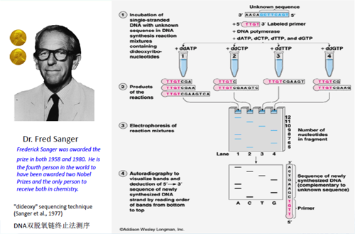 测序方法的进步推动精准医学发展 1977年,当剑桥大学的F.Sanger等人发明了利用DNA聚合酶的双脱氧链终止原理测定核苷酸序列的方法之后,研究人员发表了第一个进行全基因组测序的噬菌体的基因组PhiX174(全长5375个碱基),那时在一年内可对1000个碱基对进行测序。 当时研究者预计:若按照现有的测序方法,就是对埃希氏大肠杆菌进行全基因组测序,需要1000年的时间;若是对人类进行全基因组测序,则需花费一百万的时间。 1995年第一次发表了两个独立生活的细菌的基因组,它们是流感嗜血菌和生殖道支原体。 从1977到1995年的18年间,人们测定了近千个“完全”基因组,不过那全是病毒和噬菌体(细菌的“病毒”)这类寄生生物的基因组。