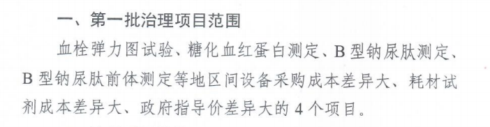 第一批治理项目包含血栓弹力图试验、糖化血红蛋白测定、B型钠尿肽测定、B型钠尿肽前体测定等地区间设备采购成本差异大、耗材试剂成本差异大、政府指导价差异大的4个项目。 其中,糖化血红蛋白测定治理目标价30元(统一方法学),和浙江省齐平;收费最高的省份达100元,对比目标价,该省糖化血红蛋白收费降幅要高达70%。