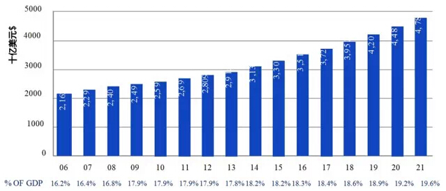 在美国,2013年的医疗服务总支出约2.9万亿美元,并且有望到2021年时提高至4.8万亿美元左右(见图3)。医疗服务支出占GDP总量的比例有望从2006年的16.2%提升到2021年的19.6%。 图3:美国年均医疗服务支出,2006-2011
