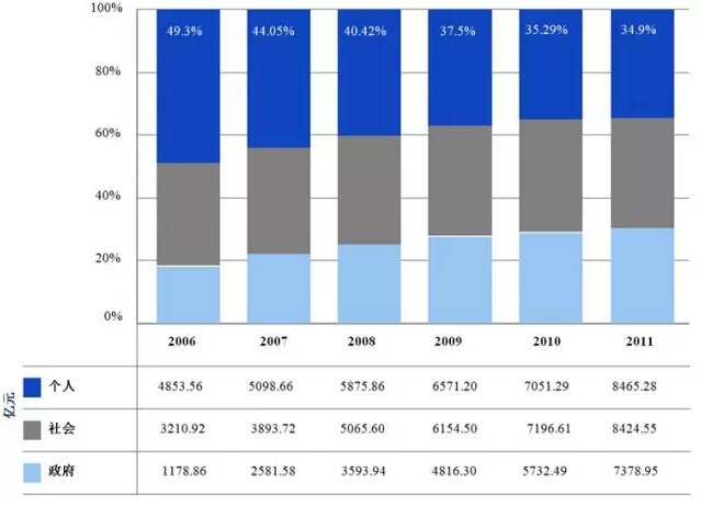 (3)承受能力的挑战 尽管科技在医疗行业正在发展,但是很多人仍无法承受个人医疗的花费。医疗支出施加于中国公民的压力很大(见图5)。最近看来,个人承担的医疗支出比例从35%到50%不等。 图5:中国的医疗开销,2006-2010
