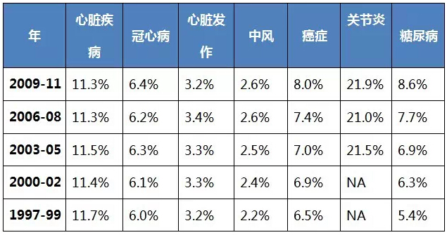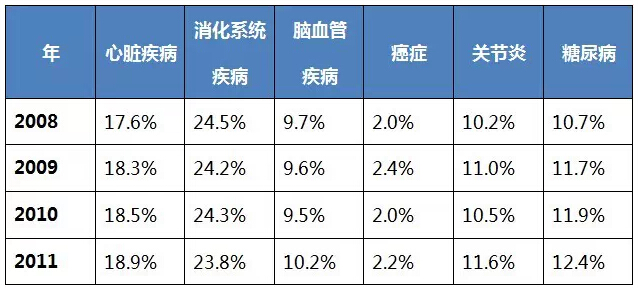 慢性疾病也是美国的一大难题,慢性疾病占医疗总费用的75%,11.3%的美国人患有心脏疾病,6.4%患冠状动脉心脏病,3.2%患有中风2.6%有心脏发作,8%患癌,21.9%患关节炎,8.6%患有糖尿病。 表2:美国慢性病发病率