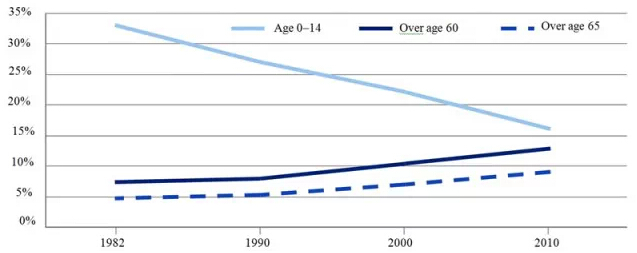 (2)人口老龄化 中国和美国同时都面临着人口老龄化问题。对于中国,现有人口的8%在65岁以上(见图4)。对于美国,3.1亿人口中有4千万人(合12.9%)的年龄在65岁以上。由于婴儿潮一代人的退休,美国的这一比例预计将提升至20%。 图4:中国的人口比例,1982–2010