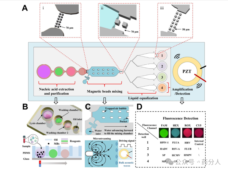 图1.用于同时检测多种呼吸道病原体的集成微流控芯片。(A) 芯片结构和功能分区的示意图 (i),(ii) 和 (iii) 表示微柱的示意图,显示了它们之间的距离。(B) 核酸提取和纯化区的顶视图和侧视图。(C) 气泡阵列结构的示意图: 蓝色表示双蒸水,从左向右平稳前进以形成气泡。PZT提供声波诱导微流实现有效的混合。(D) 12种病原体 (包括细菌和病毒) 的多重荧光检测的示意图。
