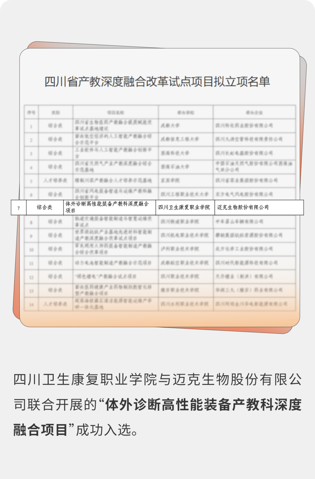 2024年10月,按照公平、公正、客观、择优的原则,经学校和企业联合申报,教育厅、财政厅、经济和信息化厅、科技厅共同组织专家对申报项目进行评审,确定了四川省2024年立项建设的15个产教融合示范项目名单。 迈克生物公司与学校联合开展的“体外诊断高性能装备产教科深度融合项目”,聚焦老年疾病负担过重、早筛成本高、高素质技术技能人才短缺等痛点,旨在培养懂康复、会检验、精技术的高素质技术技能人才、开展体外诊断关键技术攻关和成果转化。 通过项目实施,形成“三主体三段递进”的人才培养模式,为医药健康高性能装备产业提供人才支撑和智力支持。同时,建立“三新”转化体系,服务老年慢病重病的早期筛查、干预和康复需求,为应对人口老龄化提供四川方案。形成“1+1+N”产教联合体“六融六共”实体化运行机制,为产教科深度融合提供四川样本。 迈克生物践行"科技服务人类健康"的企业使命,与高校联手,培养新一代的技术精英,探索可持续发展的科研道路,让学术理论、检验技术与产业应用无缝链接,深化推进产教融合项目、推动医学进步、为社会创造价值。 |