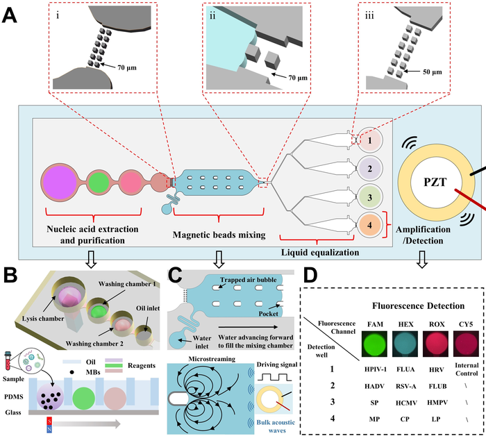 卞晓军介绍,这项研究的核心在于高度集成化的设计。芯片整合了磁珠核酸提取与纯化、声流驱动混合、液体等量分配以及多重PCR扩增和原位荧光检测等多个步骤,实现了样本处理到结果分析的全自动化流程。研究团队利用微柱和气泡捕获阵列结构,实现了磁珠的高效混合,能够在35秒内完成混合,为后续核酸提取和检测提供均匀的磁珠混合物。同时,研究团队利用油包水体系有效防止了交叉污染。