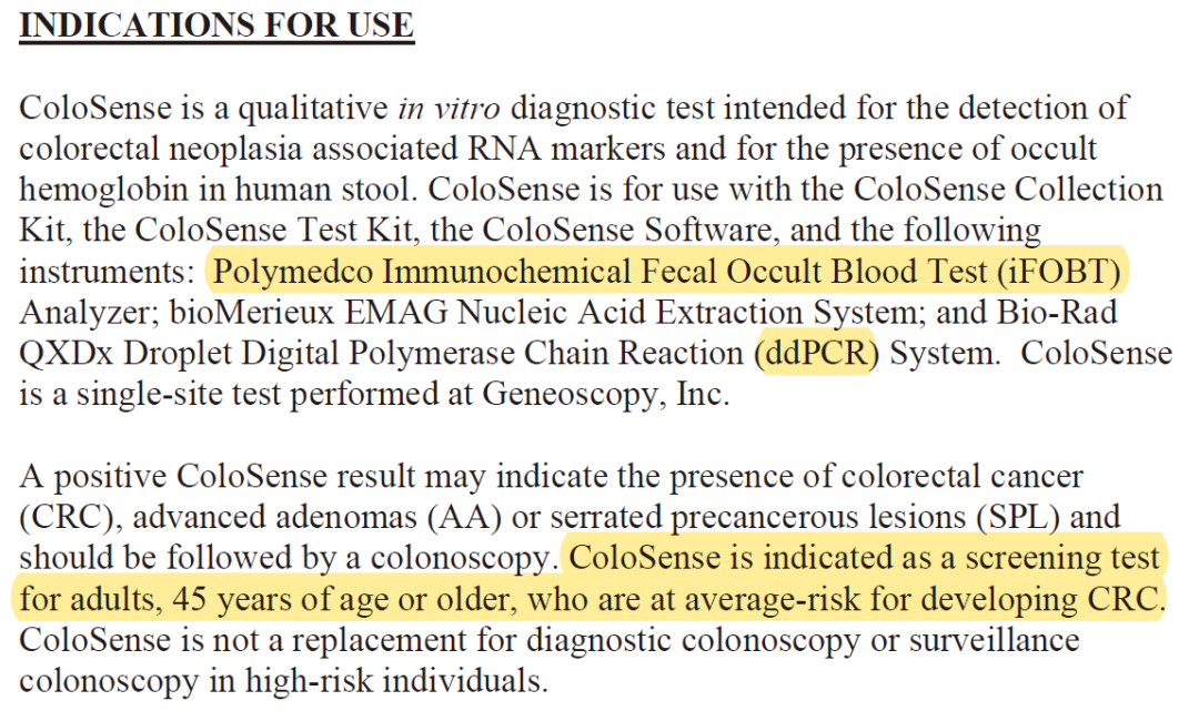 下图是FDA公示的其详细的用途说明:和Exact Science的两个Cologuard试剂盒一样,其也是在FIT的基础上进行开发,对于RNA的检测没有使用常规的qPCR,而是使用了检测限更低的数字PCR