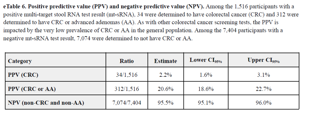 对于肠癌患者的PPV为2.2%,对于肠癌和AA的共同的PPV为20.6%,NPV为95.5%: