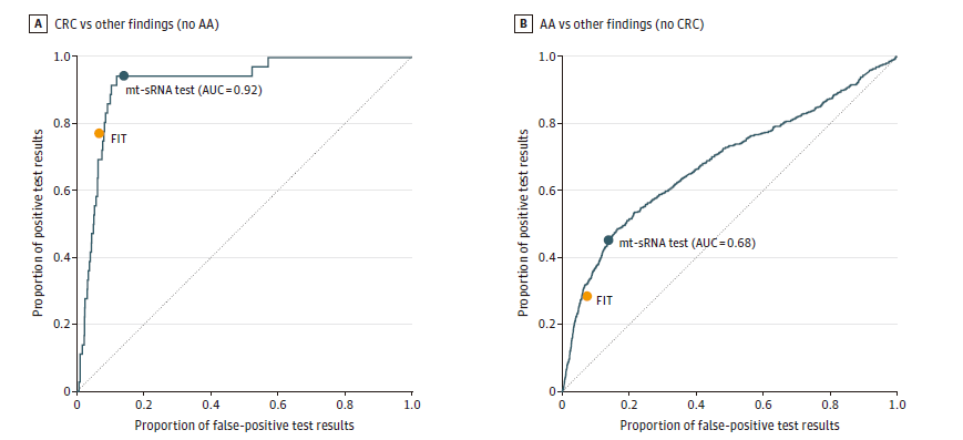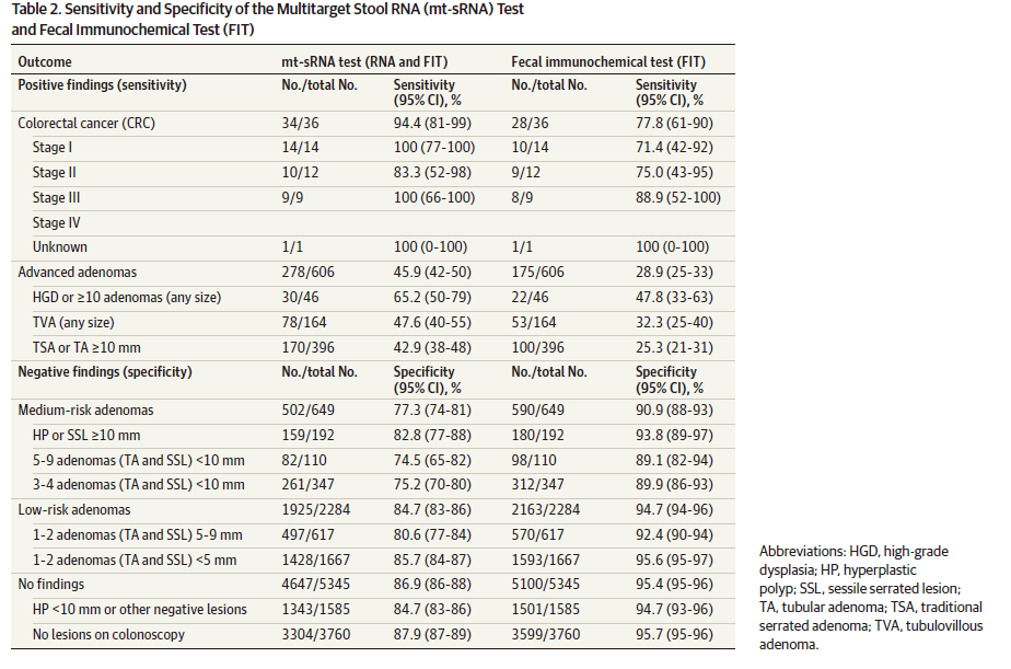 相比FIT敏感性提高了很多(肠癌:94.4% vs 77.8%,AA:45.9% vs 28.9%),但却牺牲了不少的特异性(肠镜完全正常人群:87.9% vs 95.7%)。