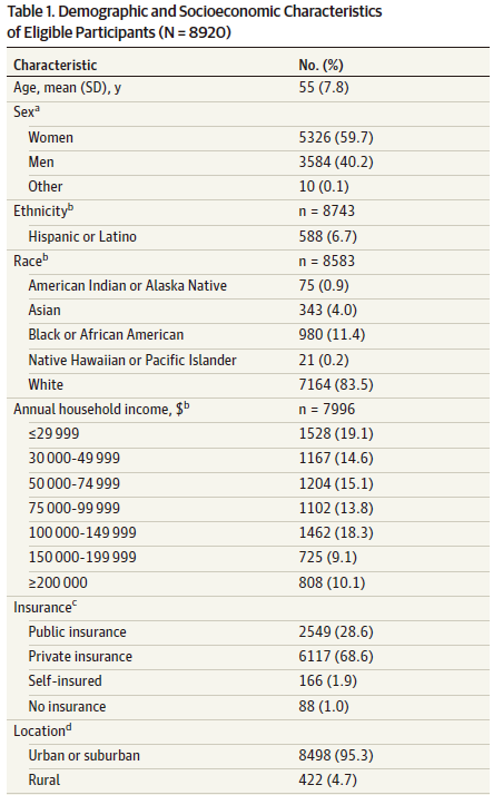 女性占比更高(接近60%),一半的参与者家庭收入在75000美金以上,95.3%的参与者都是城市人口,接近70%的参与者都有购买私人保险。