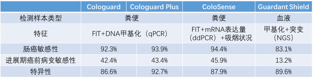 最后是4个肠癌早筛产品的性能汇总表: