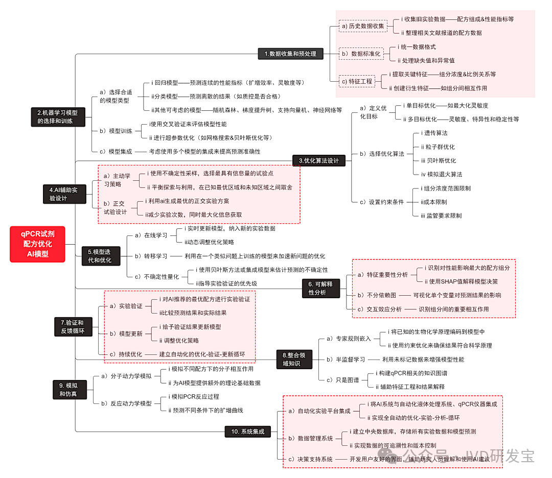 Hello啊,宝子们!萌猪我又来啦~今天我想和大家聊聊人工智能(AI)!没错,不是那种只会聊天的AI,而是能设计和优化qPCR体外诊断试剂盒配方的AI!听起来是不是很高大上?让我们一起揭秘这个神秘的“配方大师”吧! 一. AI何加速qPCR诊断试剂研发? 使用人工智能(AI)来设计和优化qPCR体外诊断试剂盒的配方是一个非常前沿和有潜力的方向。这种方法可以大大提高优化效率,减少实验次数,并可能发现人类难以察觉的复杂关系。 首先,什么是qPCR?简单来说,就是一种检测DNA的小工具,能够帮助我们识别各种微生物、病毒或者基因突变,简直是现代医学的“侦探”。而试剂盒就像是这个侦探的工具箱,里面装着各种神奇的药水和试剂,让它能够顺利完成“侦探任务”。但是,试剂盒的配方可不是随便调调就行的,它需要科学、严谨、甚至有点艺术的设计。想想看,如果配方设计得不对,岂不是让我们的“侦探”变成了“瞎子”?! AI的优化能力就像是一个“超级侦探”,能够从海量数据中发现我们人类可能忽视的细节。它会告诉你:“嘿,那个试剂用太多了,效果反而不好哦!”或者“这个组合的效率提升了30%!”就像是你身边的朋友,时刻关心着你的实验进展,给你最宝贵的建议。试想一下,以前的我们可能要花费几个月才能找到的配方,现在可能几天就能搞定,真是让人感叹人工智能的力量! 二. 使用AI进行qPCR试剂盒配方优化的模型方案 以下是我为大家准备的一个使用AI进行qPCR试剂盒配方优化的模型方案: 1. 数据收集和预处理 数据收集和预处理 a) 历史数据收集: 收集过去实验数据,配方组成&对应性能指标整理相关文献报道的配方数据 b) 数据标准化: 统一数据格式处理缺失值和异常值 c) 特征工程: 提取关键特征,如各组分浓度、比例关系等; 创建衍生特征,如某些组分的相互作用项。 2. 机器学习模型选择和训练 机器学习模型选择和训练 a) 选择合适的模型类型: 回归模型:预测连续性能指标(扩增效率,灵敏度) 分类模型:预测离散的结果(如是否通过质控) 可考虑模型:随机森林&梯度提升树&支持向量机&神经网络等 b) 模型训练: 使用交叉验证来评估模型性能进行超参数优化(如网格搜索&贝叶斯优化) c) 模型集成: 考虑使用多个模型的集成来提高预测准确性 3. 优化算法设计 a) 定义优化目标 单目标优化-最大化灵敏度等 多目标优化-同时考虑灵敏度,特异性,稳定性等 b) 选择优化算法: 遗传算法 粒子群优化 贝叶斯优化 模拟退火算法 c) 设置约束条件: 组分浓度范围限制 成本限制 监管要求限制 4. AI辅助实验设计 a) 主动学习策略: 用不确定性采样,选择最具信息量的实验点; 平衡探索与利用,在已知最优区域和未知区域。 b) 正交实验设计: 利用AI生成最优的正交实验方案 减少实验次数,同时最大化信息获取 5. 模型迭代和优化 a)在线学习: 实时更新模型,纳入新的实验数据; 动态调整优化策略 b)转移学习: 利用类似问题训练的模型加速新问题的优化 b)不确定性量化: 使用贝叶斯方法&集成模型估计预测不确定性; 指导实验验证的优先级。 6. 可解释性分析 a) 特征重要性分析: 识别对性能影响最大的配方组分,使用SHAP (SHapley Additive exPlanations) 值解释模型决策 b) 部分依赖图: 可视化单个变量对预测结果的影响 c) 交互效应分析: 识别组分间的重要相互作用 7. 验证和反馈循环 a) 实验验证: 对AI推荐的最优配方进行实验验证 比较预测结果和实际结果 b) 模型更新: 基于验证结果更新模型 调整优化策略 c) 持续优化: 建立自动化的优化-验证-更新循环 8. 整合领域知识 a) 专家规则嵌入: 将已知的生物化学原理编码到模型中 使用约束优化来确保结果符合科学原理 b) 半监督学习: 利用未标记数据来增强模型性能 c) 知识图谱: 构建qPCR相关的知识图谱 辅助特征工程和结果解释 9. 模拟和仿真 a) 分子动力学模拟: 模拟不同配方下的分子相互作用 为AI模型提供额外的理论基础数据 b) 反应动力学建模: 模拟PCR反应过程 预测不同条件下的扩增曲线 10. 系统集成 a) 自动化实验平台集成: 将AI系统与自动化液体处理系统和qPCR仪器集成; 实现全自动的优化-实验-分析循环。 b) 数据管理系统: 建立中央数据库,存储所有实验数据和模型预测; 实现数据的可追溯性和版本控制。 c) 决策支持系统: 开发用户友好界面,辅助研究员理解使用AI建议。 三. 总结 这个AI辅助的qPCR试剂盒配方优化方案结合了机器学习、优化算法、实验设计和领域知识,旨在加速优化过程,提高效率和效果。 随着技术的不断进步,这个方案还可以进一步扩展,例如纳入更高级的AI技术如强化学习、图神经网络等,以及结合新兴的实验技术如微流控芯片等。 最终目标是建立一个智能、自主的qPCR试剂开发平台,能够快速响应新的诊断需求,大幅缩短从概念到产品的时间。 |