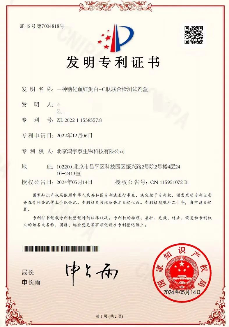 鸿宇泰生物荧光免疫平台的糖化血红蛋白/C肽联检产品,为国内独家,获得国家知识产权局授予的国家发明专利(专利号:ZL202211558557.8)!该项目适用单通道、六通道、12通道及全自动荧光仪器,满足各类型客户需求,适合在各级医疗机构广泛使用。