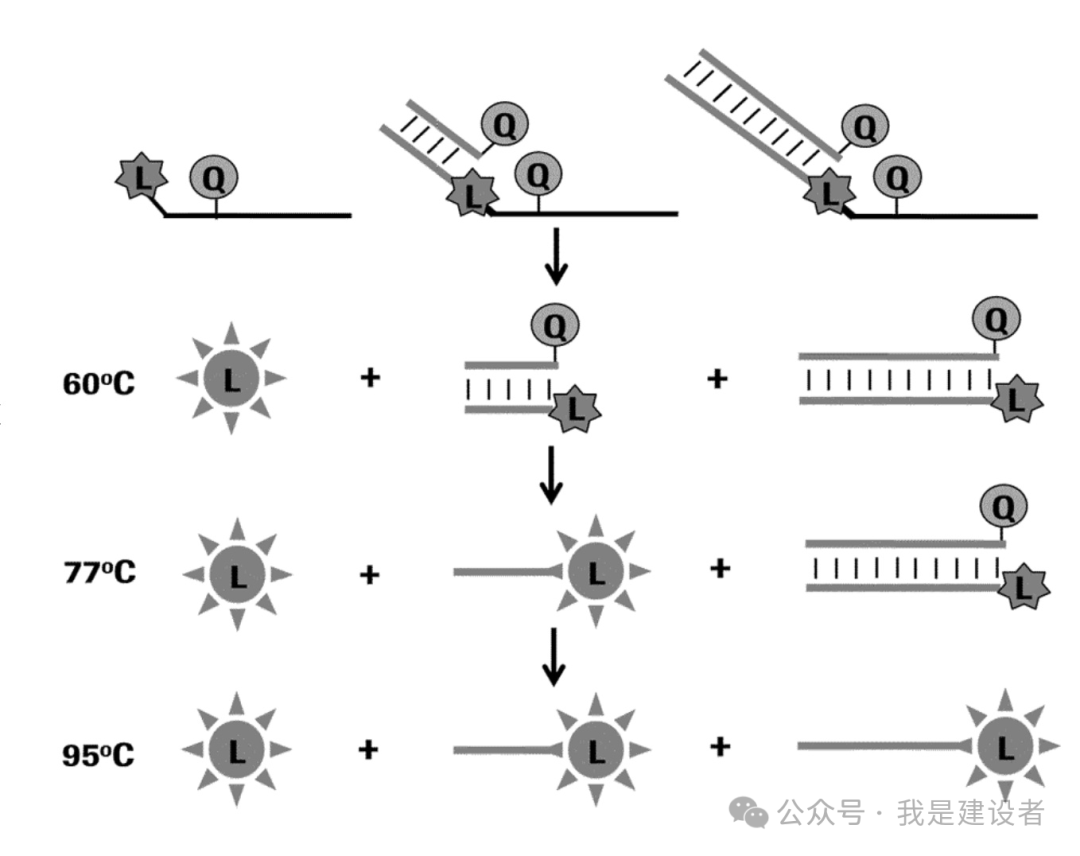 除了使用在低温下激活的标准荧光报告基团(在罗氏现有的 PCR 检测中都有使用),TAGS 使用两组可逆热活化荧光报告基团,它们的颜色在较低温度下不可见,但在逐渐升高后的较高温度下才会出现。