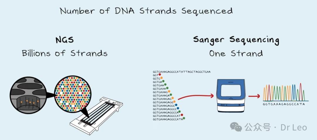 - 技术对比:最初使用的是Sanger测序技术,一次只能测序一条DNA链。而NGS技术可以同时测序数十亿条DNA链,大大提高了速度。