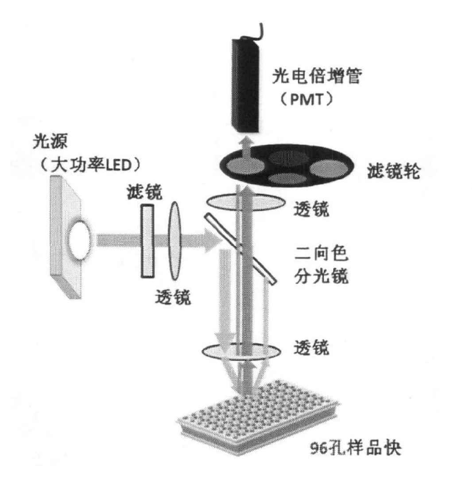 汞灯:汞灯是一种气体放电光源,是初期荧光计的主要激发光源。它是利用汞蒸气放电发光的光源。它所发射的光谱与灯的汞蒸气气压有关。单色LED光源光源成本低、使用寿命长,使用期间基本无需维护,在现在的中低端定量PCR市场中几乎占据统治地位;而近几年发展起来的白光LED,兼具卤钨灯光谱范围宽和LED性能稳定寿命的优点,在中高端定量PCR仪中使用较多。在定量PCR设备中主要使用滤光片进行单色滤光,光栅型单色系统在定量PCR设备中比较少见。高压氙弧灯是目前荧光分析仪器中应用最广泛的一种光源。这种灯的灯管是用耐高温、热膨胀系数小的透明石英管做成,管内充有高纯度的氙气。通电时,氙气受激发,射出强烈的白光。荧光检测系统一般由传输荧光的光学系统和探测、处理荧光信号的电子系统组成。由于激发光源发出的光是散射光,需要通过透镜变成平行光。蓝色的光谱特性包含了其他杂散光对系统造成干扰,为此需要合适的滤镜滤除不必要的波段。激发光通过二向色镜发生反射,再通过透镜聚焦到样本,激发荧光物质发出荧光。荧光物质发出的荧光通过透镜形成平行光,只有在透镜焦点附近的荧光才能进入成像系统,这样可以避免其他杂光的干扰,从光学上提高信噪比。由于二向色镜的特性,对于大于一定波长范围的光可以透过二向色镜而不会发生反射,荧光穿过二向色镜通过透镜会聚到焦点进入光电探测器。因为透过的荧光不可避免的夹杂着其他光学信息如环境光、激发光、其它荧光物质发出的光等,可进一步通过窄带滤波片滤除杂散光,提高特异性。由于入射光和发射光的方向垂直相交,为此需要使用二向色滤光片将入射光尽可能反射到样本上激发荧光物质而不要透过该滤光片,发射的荧光尽可能地透过二向色滤光片而不发生反射,同时过滤部分通过试管反射的激发光。二向色滤光片是具有两向色性的分光板,其特性是反射短波光线,透过长波光线。由于光源波长和荧光波长互不重叠,选择合适的二向色滤光片可以很好地满足上述要求。用于收集PCR反应体系中荧光信号,并将其转换为电信号。