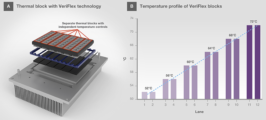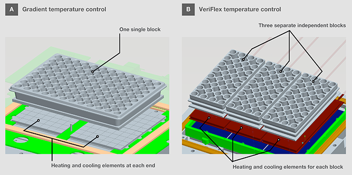 由于引物和靶标序列之间的退火过程对于成功获取PCR结果至关重要,退火温度通常都需要进行优化。为了实现对于不同温度的同时检测,梯度热模块被开发出来,以实现在单一金属模块两端设置接近理论退火温度的高、低温(A)。也有一种“Better-than-gradient”技术,通过使用绝热的独立热模块来取代单一的模块(B)。