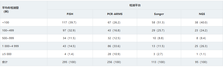 表2 各检测平台平均年检测量不同的实验室分布情况[例(%)]
