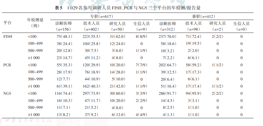 3.从业年限及年检测/报告量:从目前肿瘤分子病理较为关注的三大检测平台,即FISH、PCR和NGS,分别观察参与调研人员的从业年限及年检测/报告量。总体而言,参与调研的1 029人中从事FISH、PCR和NGS检测相关工作的年限绝大多数<5年或10年,其中617名专职人员中FISH、PCR和NGS三个平台工作年限<5年的比例分别为65.8%、52.4%和90.3%;<10年的比例分别为93.0%、91.6%和99.8%;412名兼职人员中FISH、PCR和NGS 3个平台工作年限<5年的比例分别为74.8%、75.7%和96.4%;<10年的比例分别为93.7%、95.6%和99.8%;相较于专职人员,兼职人员三个平台从业年限<5年的比例更高(表4)。进一步多平台综合分析发现,617名专职人员中从事FISH、PCR和NGS三个平台的工作年限均≥5年的仅有35人,包括技术人员18人、诊断医师13人和研究人员4人。从个人年检测/报告数量分析,参与调研的1 029人中FISH、PCR和NGS单平台年检测量大多数<500例,其中617名专职人员中FISH、PCR和NGS单平台年检测/报告量<500例的比例分别为79.6%、50.4%和84.4%;412名兼职人员中上述比例分别为93.9%、76.9%和96.8%,均高于专职人员中的占比。另外,值得一提的是,专职人员中PCR平台年检测/报告量≥1 000例的比例较高,约39.7%,且显著高于兼职人员中的该比例(表5)。进一步多平台综合分析发现,617名专职人员中FISH、PCR和NGS三个平台的年检测/报告量均≥500例的仅26人,包括技术人员12人、诊断医师12人、研究人员2人。