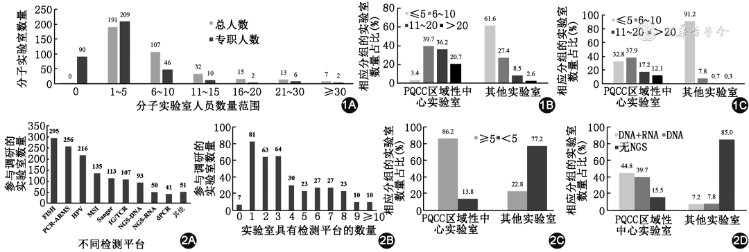 2.总体人员情况:365个实验室共有2 660人,其中1 227人为专职分子病理人员,占比46.1%;1 433人为兼职分子病理人员(指组织病理医技人员兼做分子病理检测或报告的人员),占比53.9%。以实验室从事分子病理总人数分析,仅有1~5人的实验室占一半以上(191/365,52.3%),6~10人者107个(29.3%)、11~15人者32个(8.8%)、16~20人者15个(4.1%)、21~30人者13个(3.6%)、30人及以上者7个(1.9%);以实验室专职分子病理人数分析,仅有1~5人的实验室为209个(57.3%),6~10人者46个(12.6%)、11~15人者10个(2.7%)、16~20人者2个(0.5%)、21~30人者6个(1.6%)、30人及以上者2个(0.5%)。值得注意的是,另有24.7%(90个)实验室没有专职分子病理相关人员(图1A)。随后,我们进一步比较分析了参与调研的PQCC区域性中心实验室与其他实验室的分子病理相关人员情况。以实验室从事分子病理总人数分析,绝大部分(96.6%,56/58)PQCC区域性中心实验室具有5人以上的团队,其中39.7%(23/58)的PQCC区域性中心实验室有6~10人,36.2%(21/58)实验室有11~20人,20.7%(12/58)实验室分子病理相关人员>20人;而非PQCC区域性中心实验室的其他实验室人员数量相对较少,大部分(61.6%,189/307)实验室分子病理相关人员≤5人,仅27.4%(84/307)的实验室有分子病理相关人员6~10人,8.5%(26/307)的实验室有10~20人,2.6%(8/307)的实验室人员数量>20人(图1B)。以实验室专职分子病理人数分析,大部分(67.2%,39/58)PQCC区域性中心实验室专职人员数量>5人,其中具有6~10人、11~20人和20人以上的实验室占比分别为37.9%(22/58)、17.2%(10/58)和12.1%(7/58);而非PQCC区域性中心实验室的其他实验室中专职分子病理人员数量较少,91.2%(280/307)的实验室专职分子病理人员数量≤5人,仅7.8%(24/307)的实验室有6~10名专职人员,0.7%(2/307)的实验室有11~20名专职人员,0.3%(1/307)的实验室专职人员数量>20人(图1C)。不管是以实验室分子病理总人数还是专职分子病理人员数量分析,PQCC区域性中心实验室中人员数量>10人的实验室数量/占比远远高于其他实验室,差异具有统计学意义(P<0.05)。从人员构成角度,参与调研的实验室中大多数人员为技术人员(47.8%)和诊断医师(43.9%),少数为研究人员(5.5%)、生信分析人员(1.8%)及其他人员(1.1%);其中诊断医师、研究及生信人员大部分具有研究生学历(80%~90%),而技术及其他人员大部分为非研究生学历(60%~80%)。